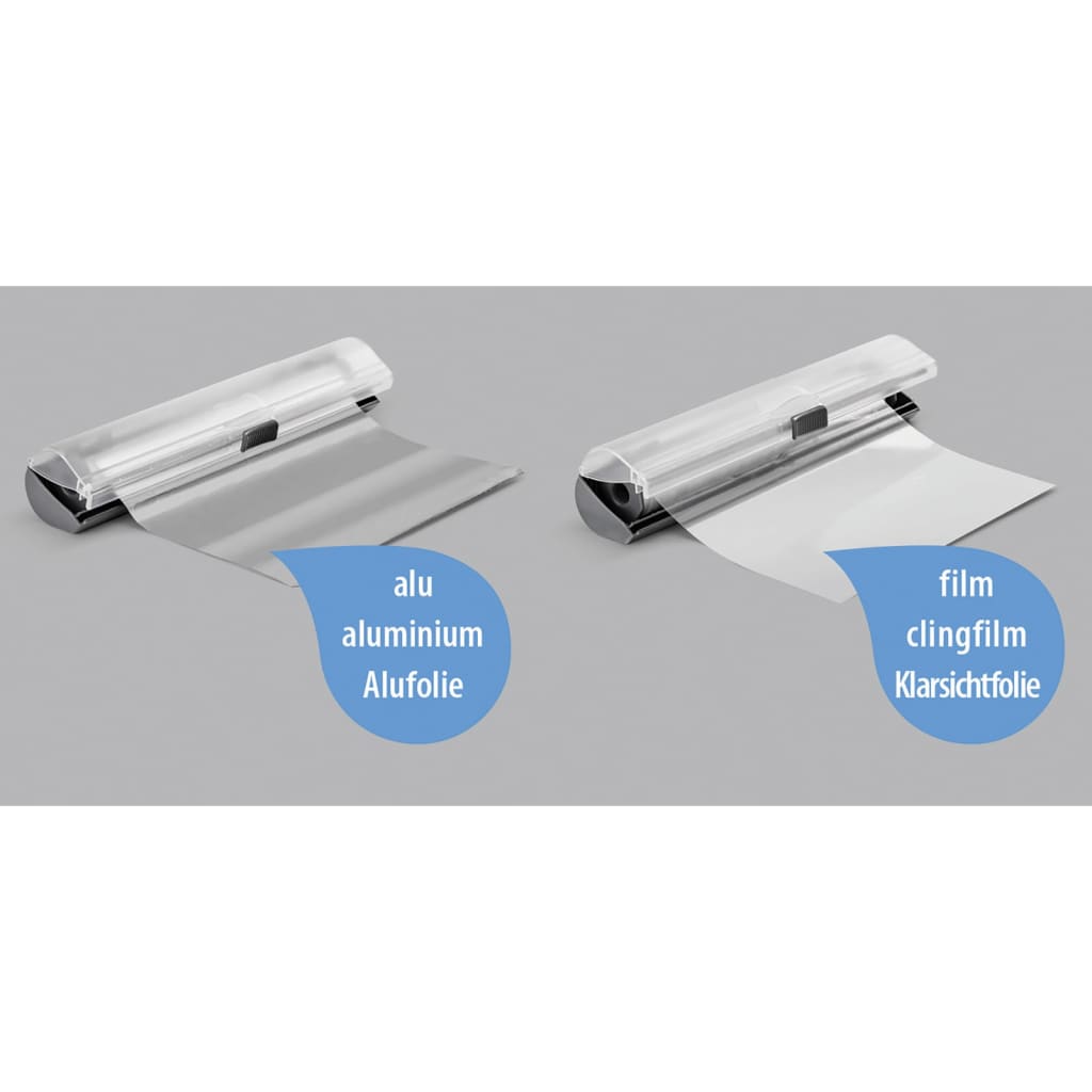 - Distributore manuale di rotoli da cucina per pellicola trasparente e in alluminio