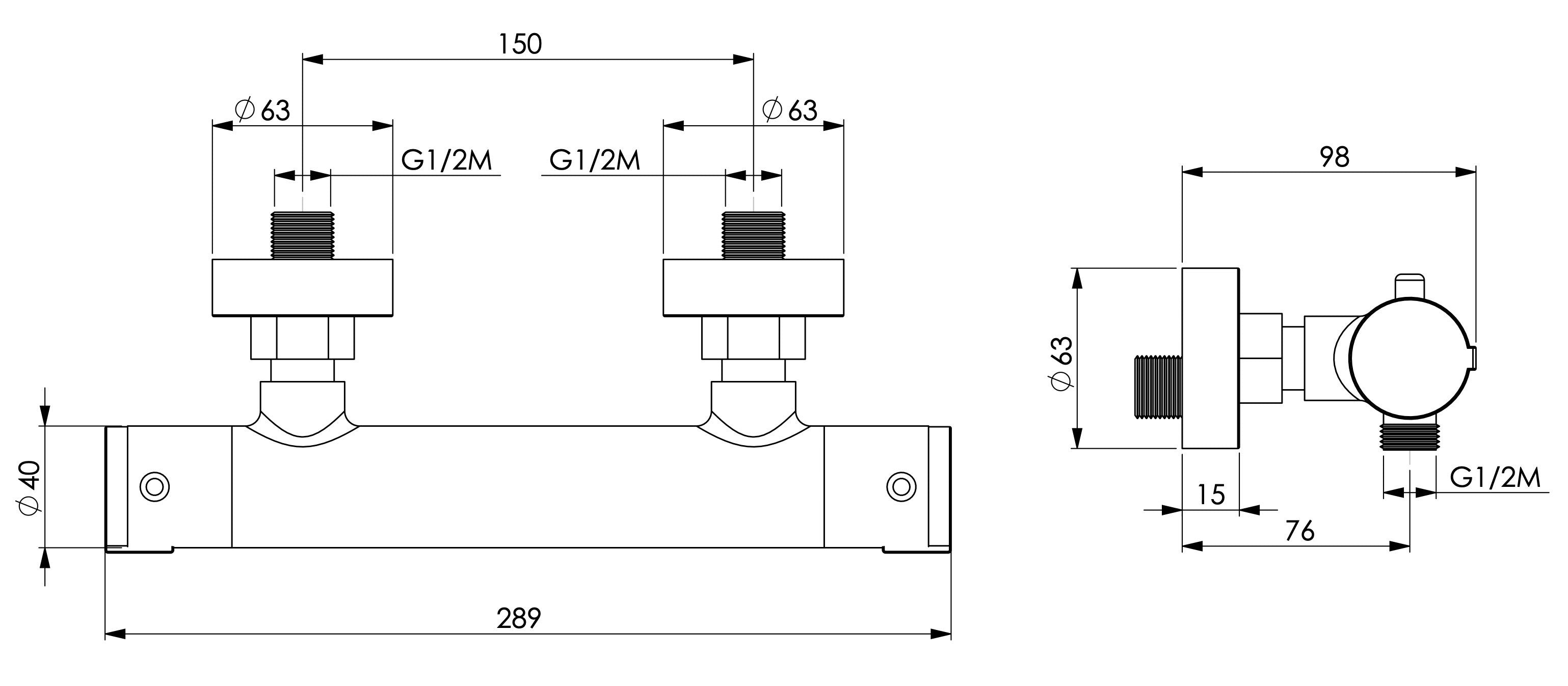 Miscelatore termostatico esterno doccia tondo con uscita 1/2M inferiore, deviatore incorporato, in ottone cromato.