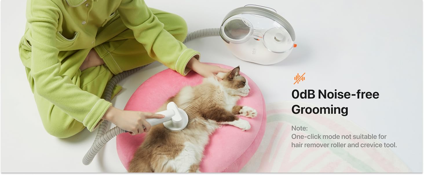 La ventola rimane silenziosa durante la toelettatura dell'animale. attivandosi solo quando si preme il pulsante di aspirazione dei peli. garantendo al tuo amico peloso una sessione di toelettatura senza rumore. La modalità a un clic non è adatta per il rullo di rimozione e la bocchetta per fessure.