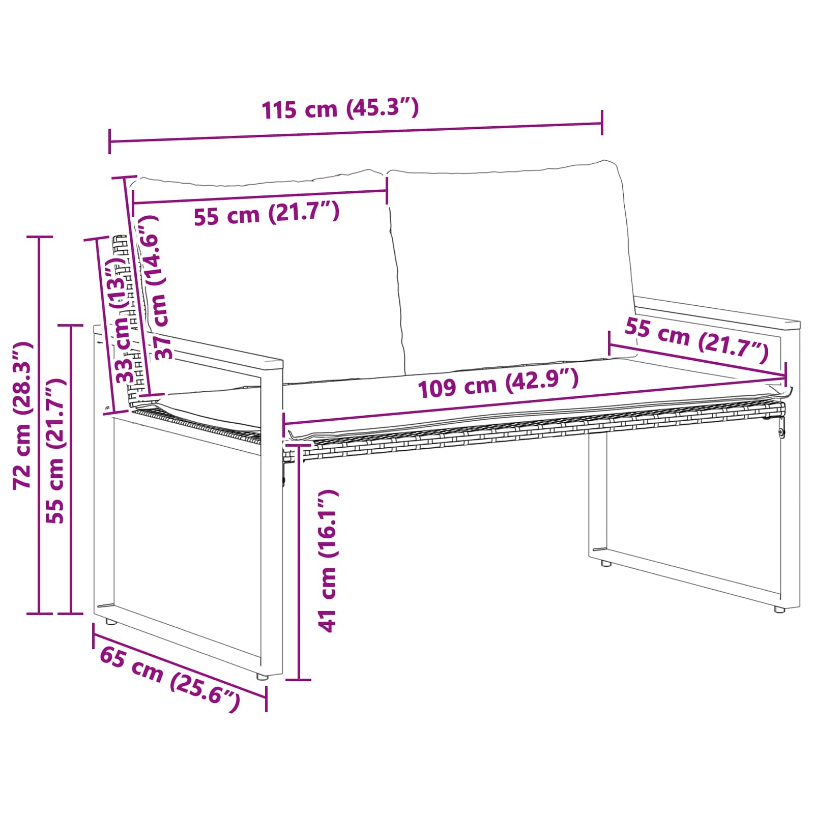 - Area salotto: 109 x 55 cm (L x P)