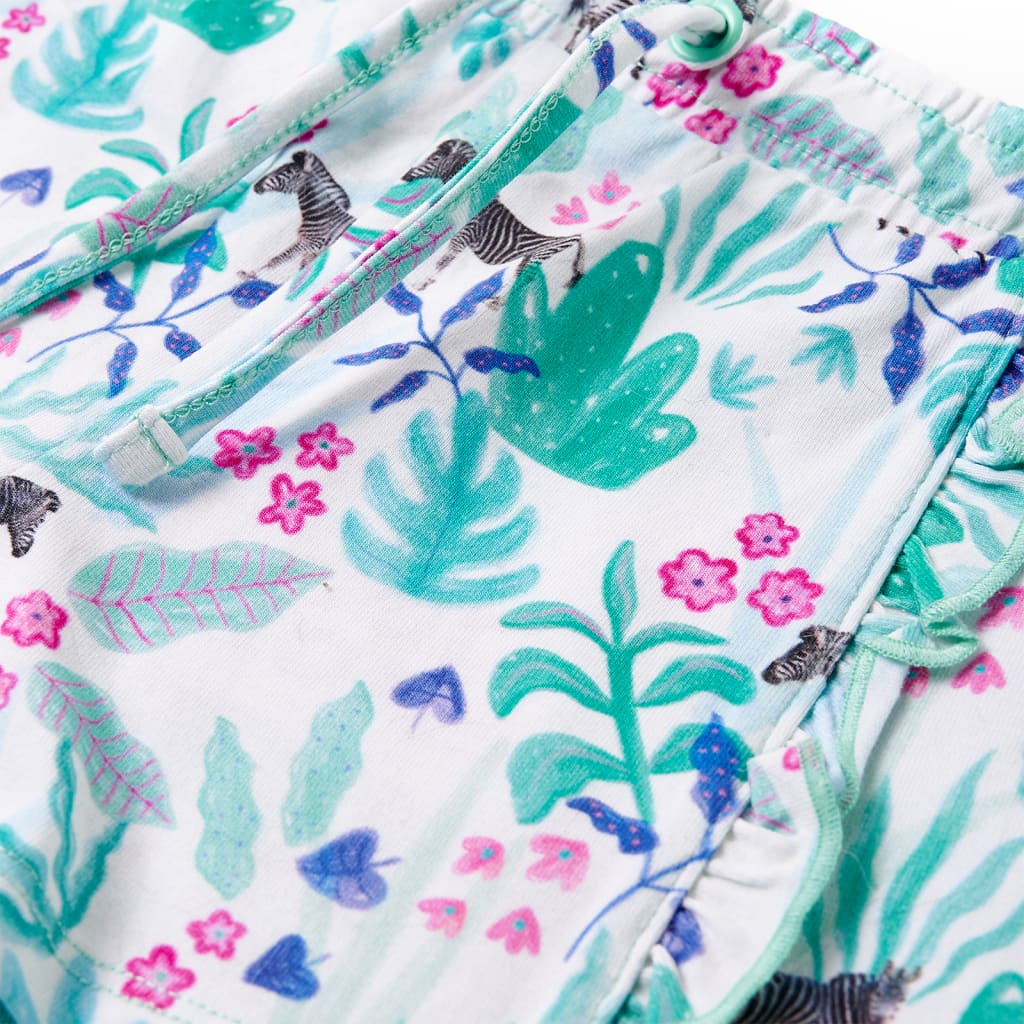Questo paio di pantaloncini per bambine ha la vita elasticizzata con la coulisse, una tasca posteriore a filetto e graziosi volant. I pantaloncini per bambine hanno le stampe di zebre e piante. I pantaloncini da bambina sono realizzati in un materiale morbido composto dal 94% in cotone e dal 6% in elastan per offrire comfort e traspirabilità.