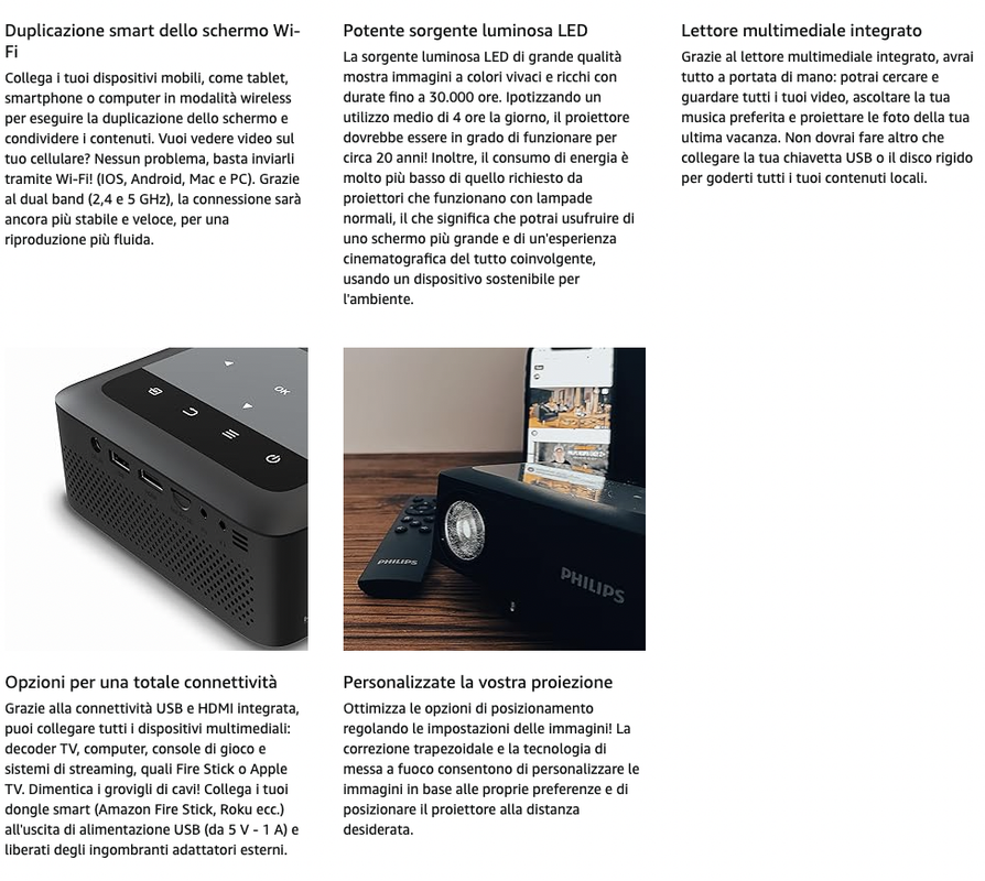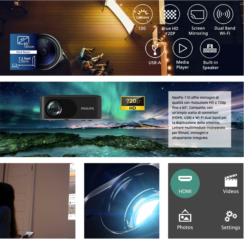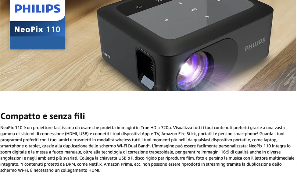 Philips NeoPix 110. Mini Videoproiettore True HD 720p. Display 65". Wi-Fi. Nero