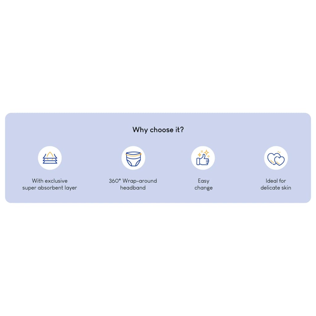 - Facile da cambiare: I pannolini a mutandina hanno i lati a strappo per offrire un cambio semplice e veloce, e possono essere smaltiti facilmente arrotondandoli con nel nastro usa e getta.