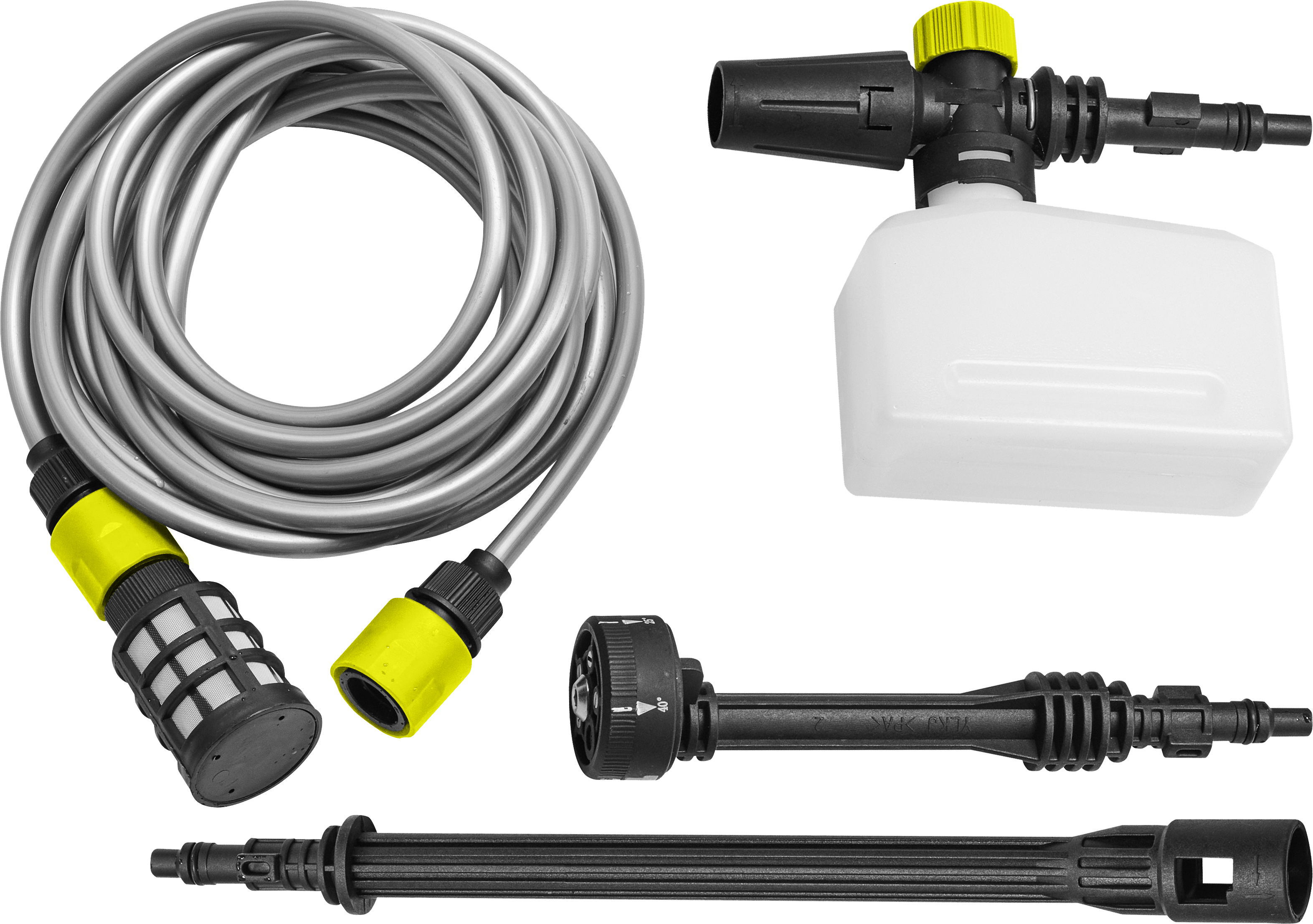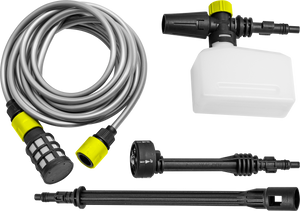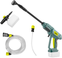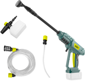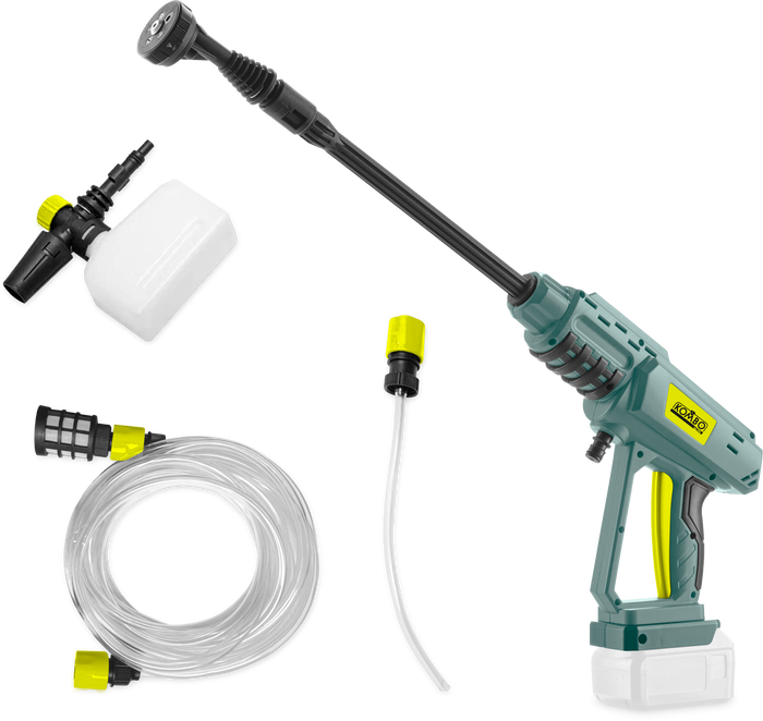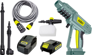 Kit Pistola idropulitrice 20V, completo di Batteria 2.0 Ah, Caricabatterie ultrarapido 2.4A (45 minuti per Carica completa), lancia con 5 ugelli (15°/25°40°/Doccia/ Schiuma), Lancia prolunga e componente per detergente.