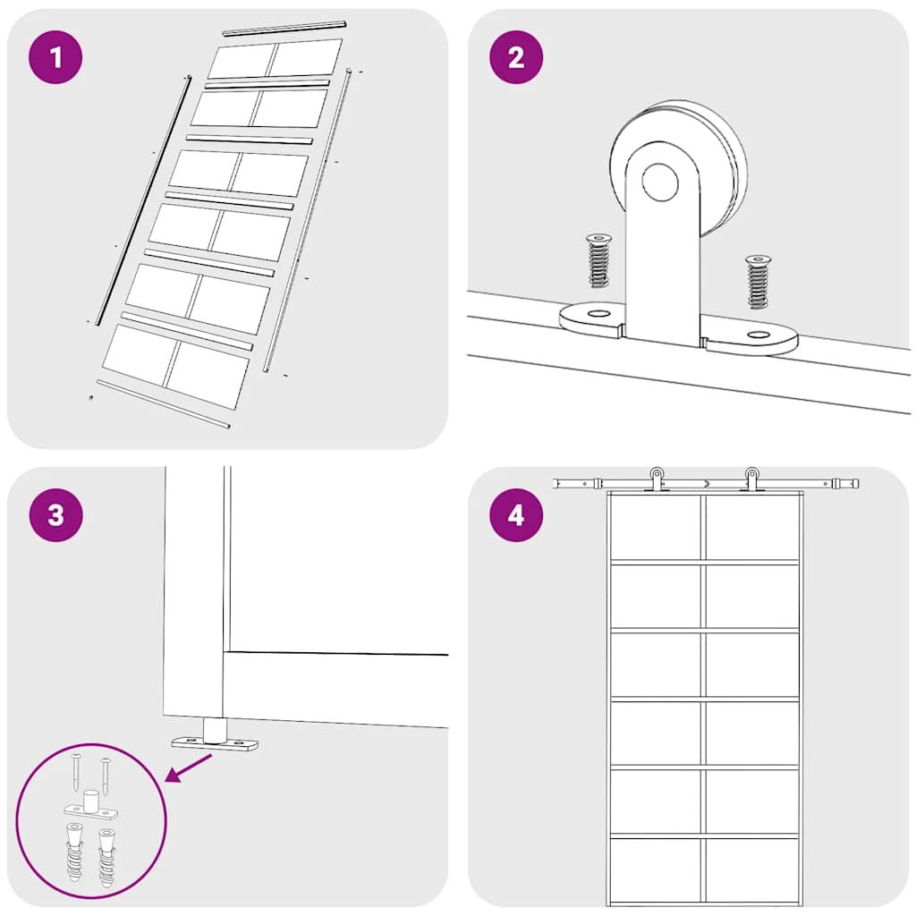 La porta può essere montata solo in combinazione con i kit di ferramenta per porte scorrevoli. Potete trovare i kit di ferramenta per porte scorrevoli abbinati nel nostro negozio (SKU: 145262-145263). Per la modalità di installazione, potete consultare il nostro manuale di installazione della porta e dei kit di ferramenta scorrevole.