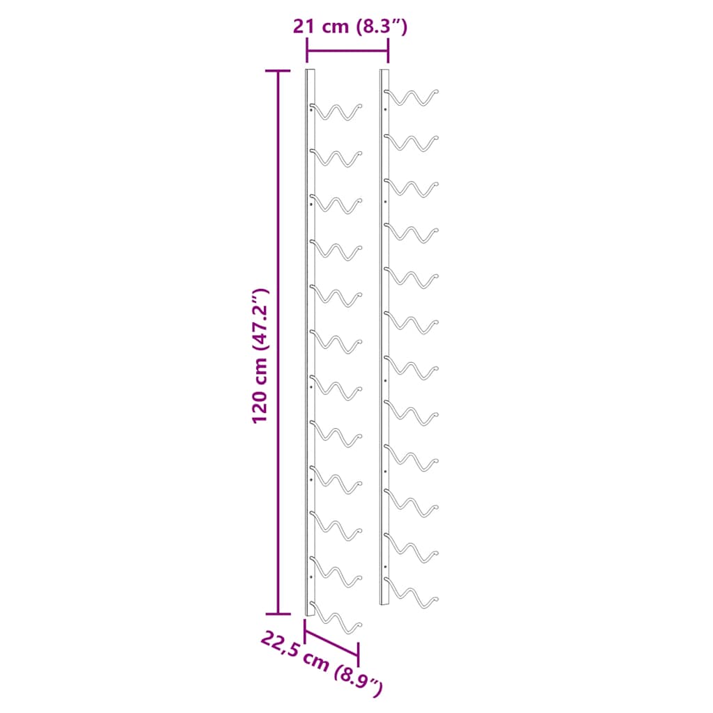 Questo portabottiglie può contenere fino a 24 bottiglie di vino. È realizzato in ferro verniciato a polvere, che lo rende estremamente resistente e di facile manutenzione. È la scelta ideale per fare un regalo ai vostri amici e conoscenti amanti del vino. Inoltre, con i materiali di montaggio inclusi, questa cantinetta per vino può essere facilmente fissata al muro. È anche facile da montare.