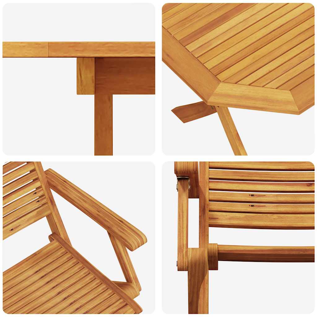 - Legno massello di acacia di alta qualità: Il set è costruito con legno di acacia di alta qualità, noto per la sua durata e naturale resilienza agli agenti atmosferici. Questo materiale robusto offre sia forza che calore, migliorando il fascino rustico del tuo spazio esterno. La sua finitura oliata non solo protegge dall'umidità, ma mette in evidenza la grana naturale del legno, garantendo estetica e longevità.