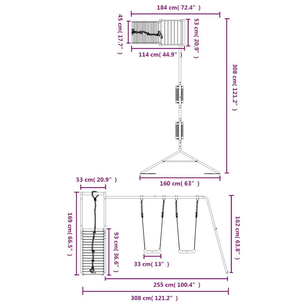 - Centri multiattività: il parco giochi è dotato di una piattaforma di 90 cm di altezza e si distingue per il set di 2 altalene, la sua parete da arrampicata con corda e sabbiera. I vostri piccoli possono anche invitare i loro amici a unirsi al divertimento.