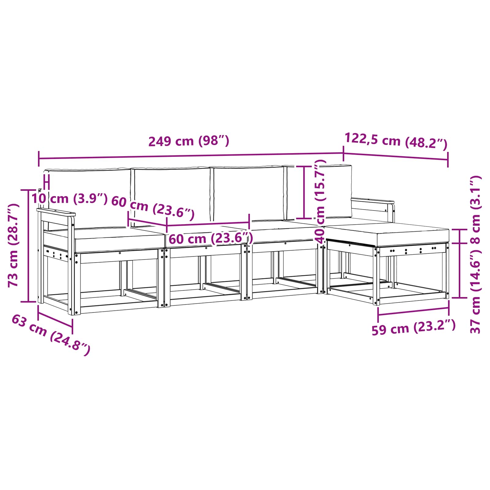 - 4 x Cuscino di Schienale: 60 x 40 x 10 cm (L x P x A)