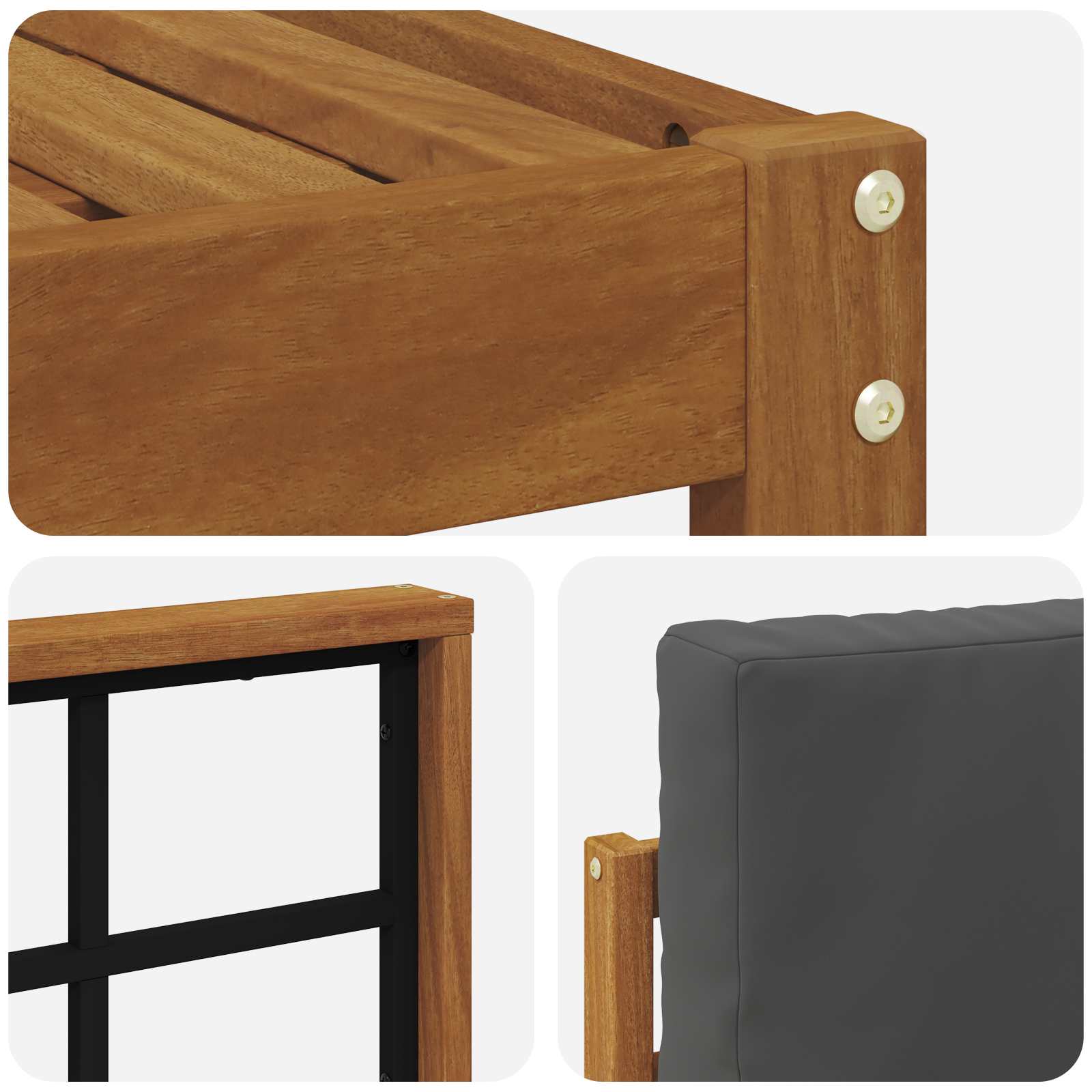 - Materiali: Ogni pezzo è fatto in legno massello di acacia robusto, rinomato per la sua resistenza e durevolezza, che richiede poca manutenzione. La grana fine e il colore caldo del legno aggiungono un tocco lussuoso a qualsiasi spazio esterno.