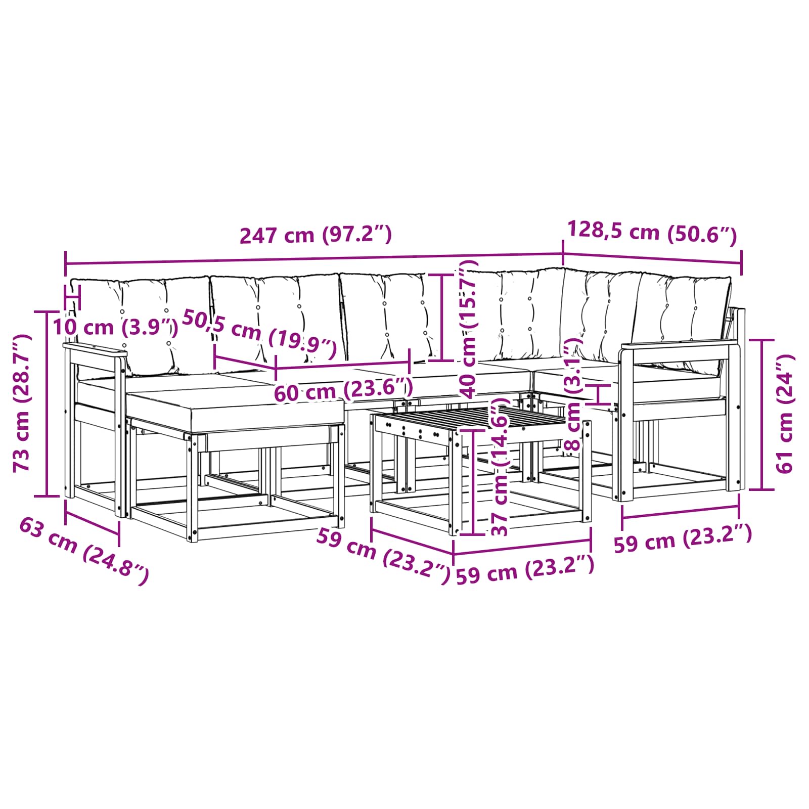 - 6 x Cuscino di schienale: 60 x 40 x 10 cm (LxWxH)