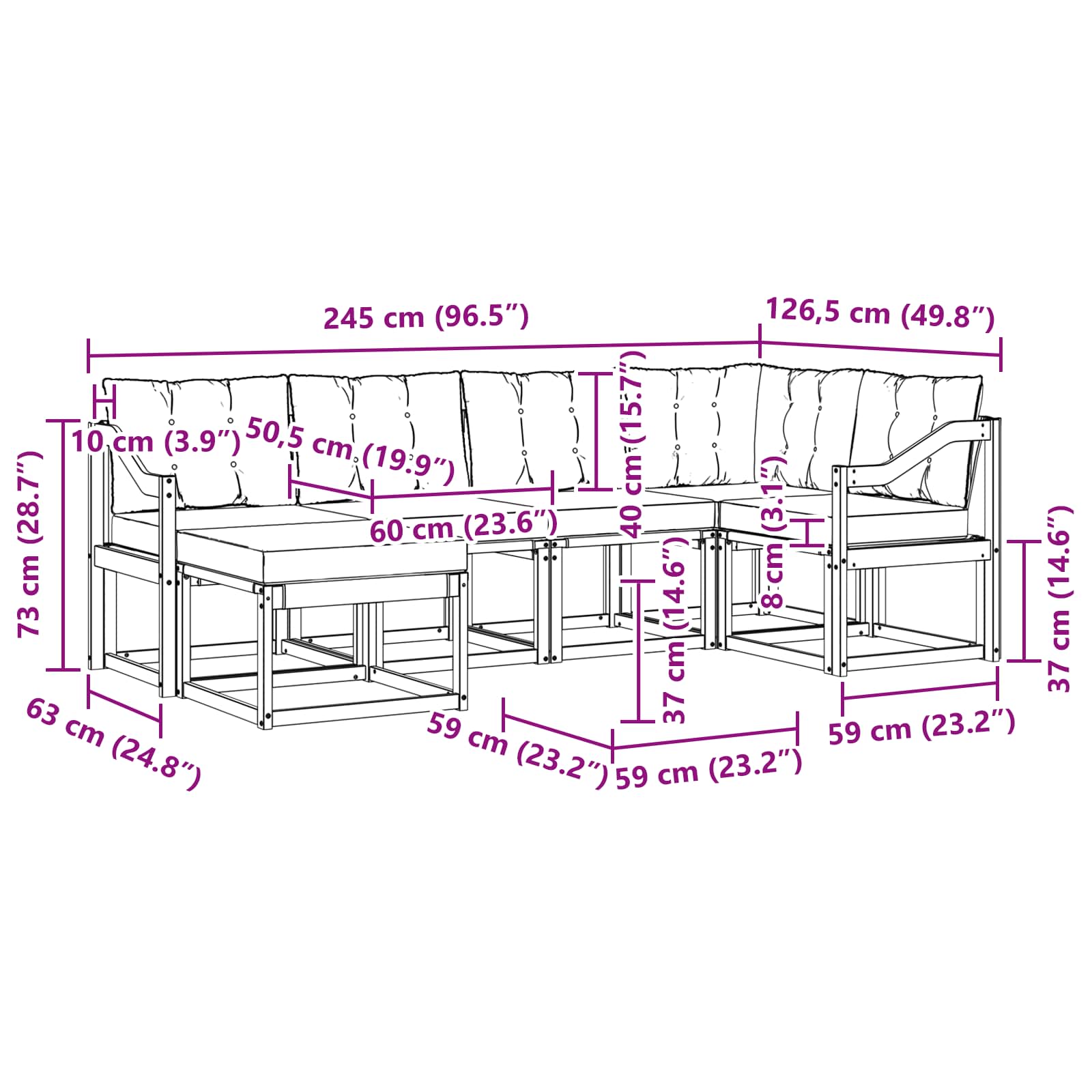 - 6 x Cuscino di schienale: 60 x 40 x 10 cm (LxWxH)