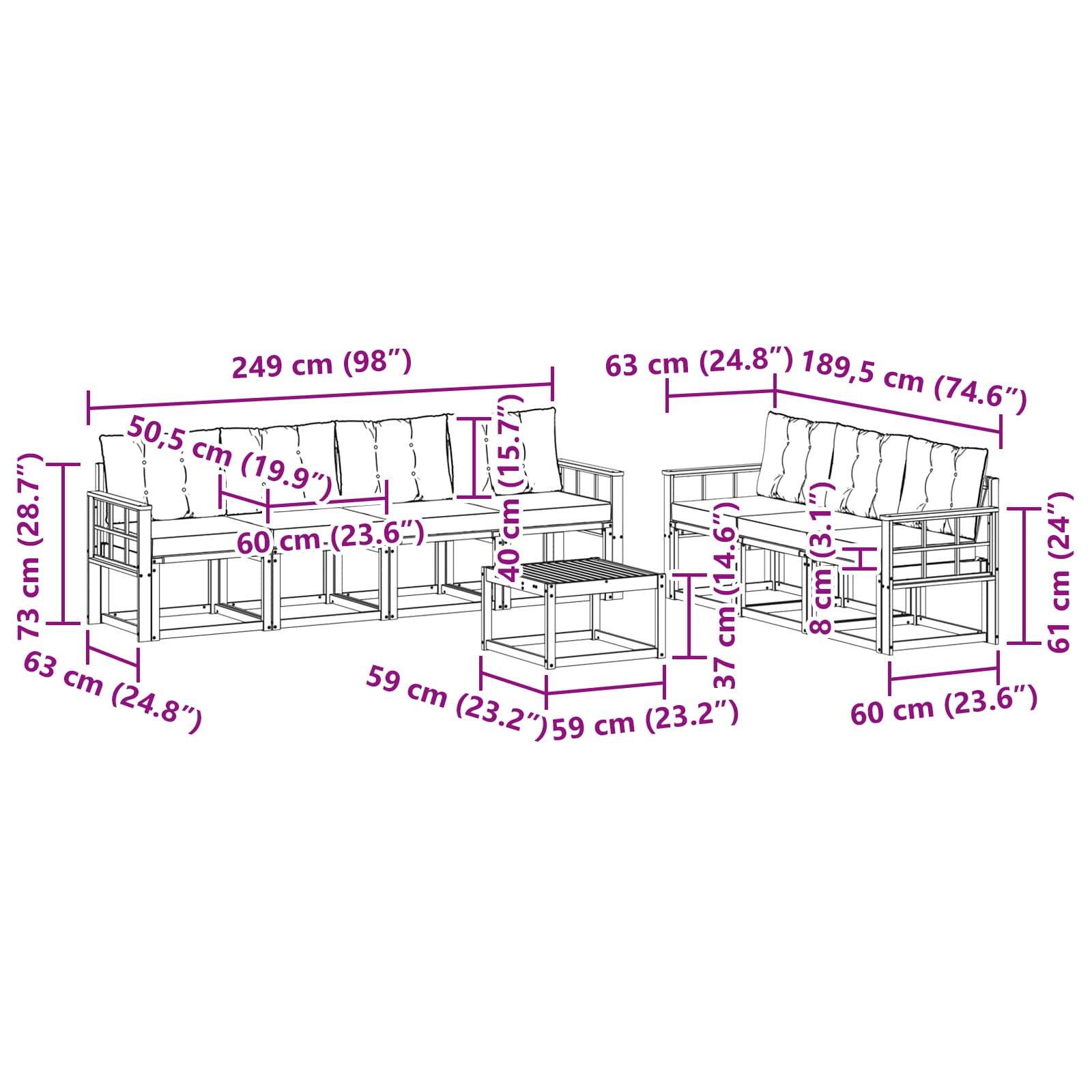 - 7 x Cuscino del Sedile: 60 x 50,5 x 8 cm (LxWxH)