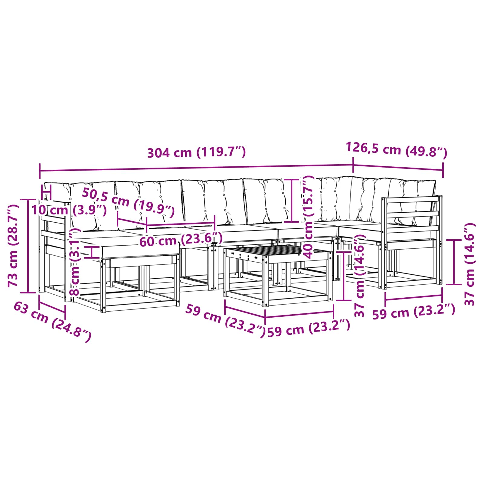 - 7 x Cuscino Posteriore: 60 x 40 x 10 cm (LxWxH)