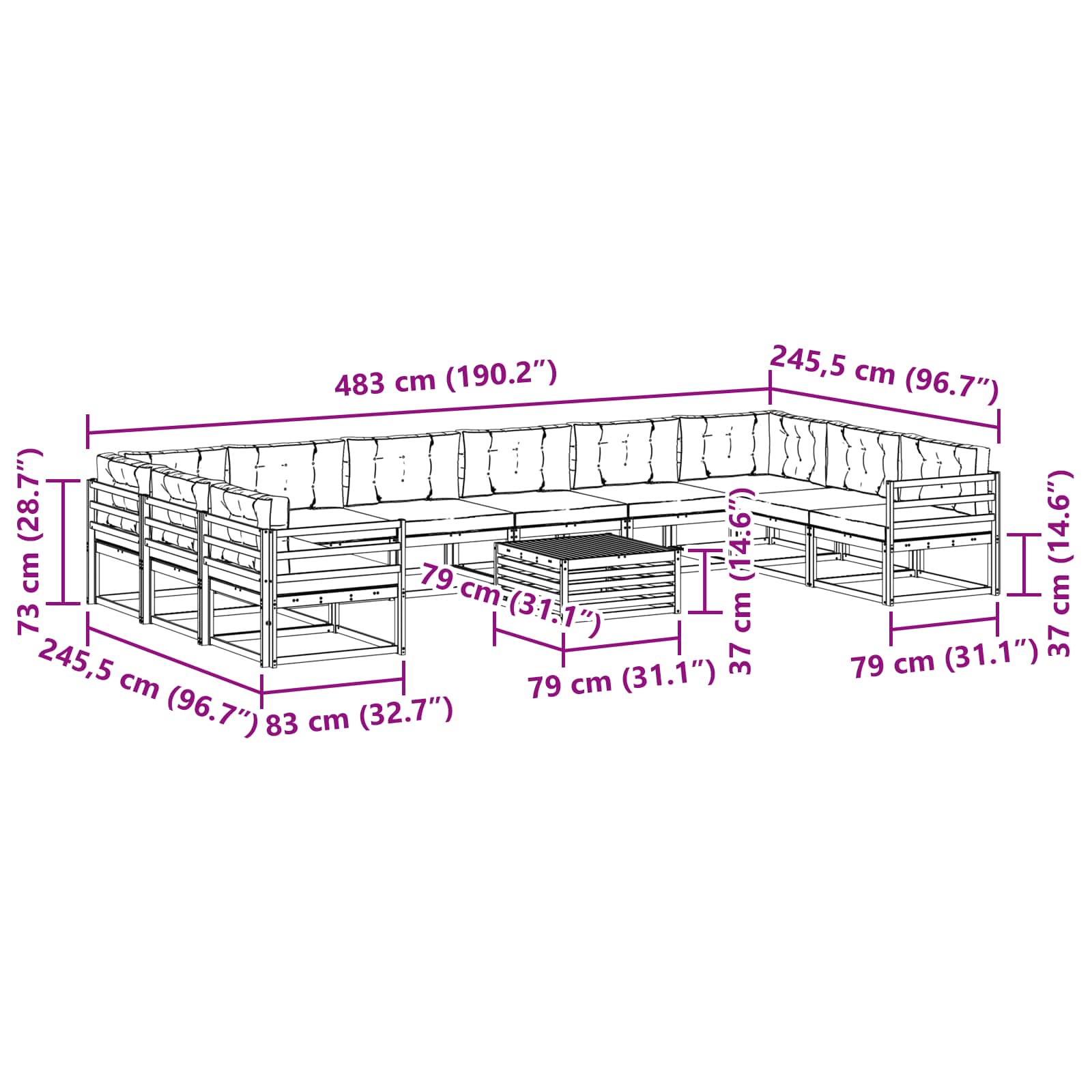 - 12 x Cuscino Seduta: 80 x 43 x 10 cm (LxPxA)
