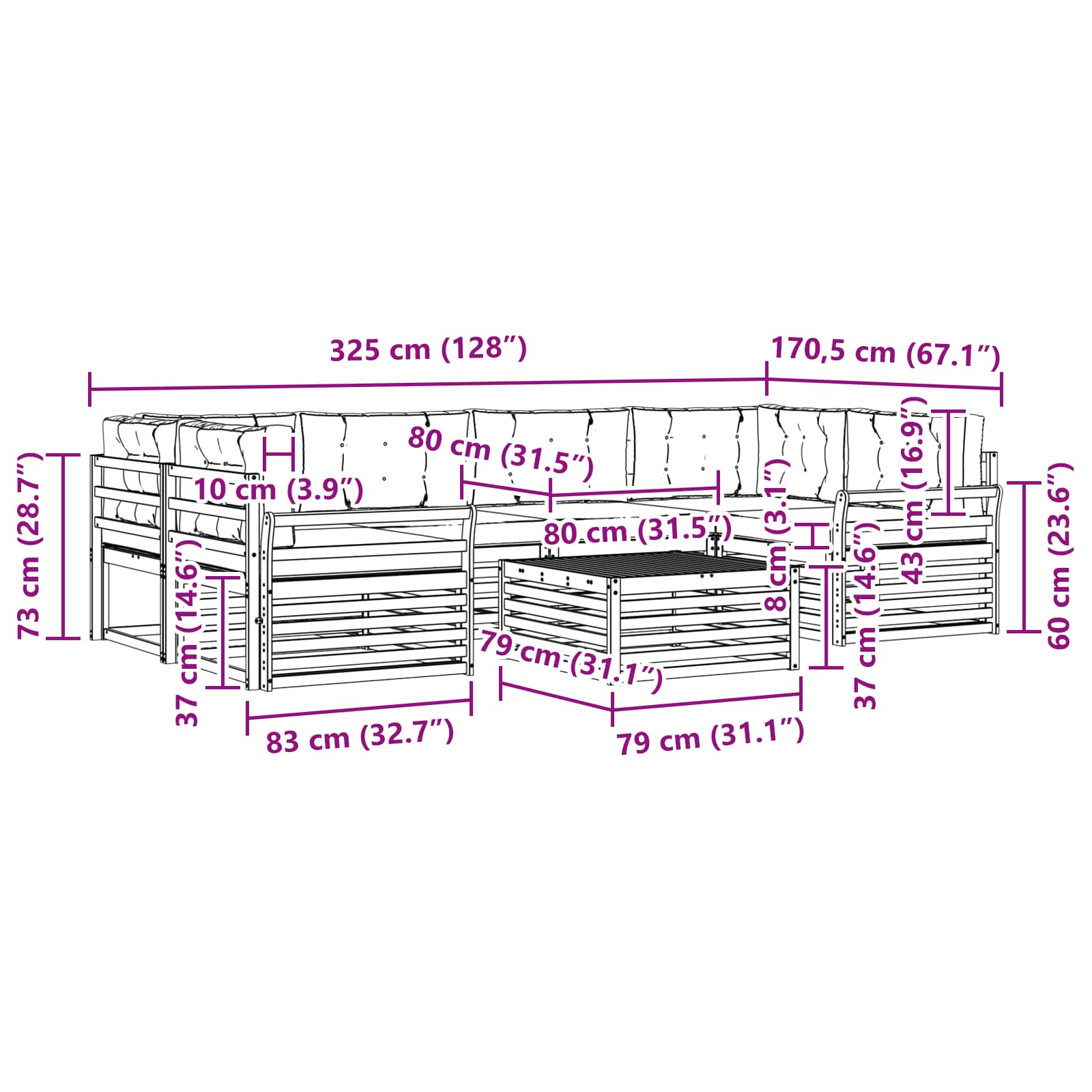 - 6 x Cuscino per seduta: 80 x 80 x 8 cm (LxPxH)