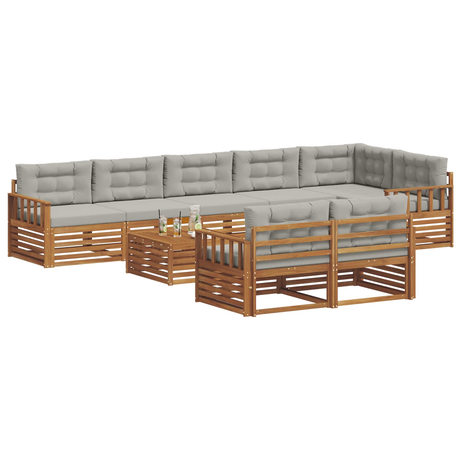 Il set di mobili da esterno combina stile e praticità, creando un punto focale unico per giardini o terrazze. Il design moderno con linee pulite e dettagli minimali aggiunge eleganza e favorisce il relax e le riunioni sociali. Realizzato in legno massello di acacia, questo set è progettato per durare e per avere un'attrattiva visiva duratura, rendendolo perfetto per chi cerca un mix di funzionalità e stile nei mobili outdoor.