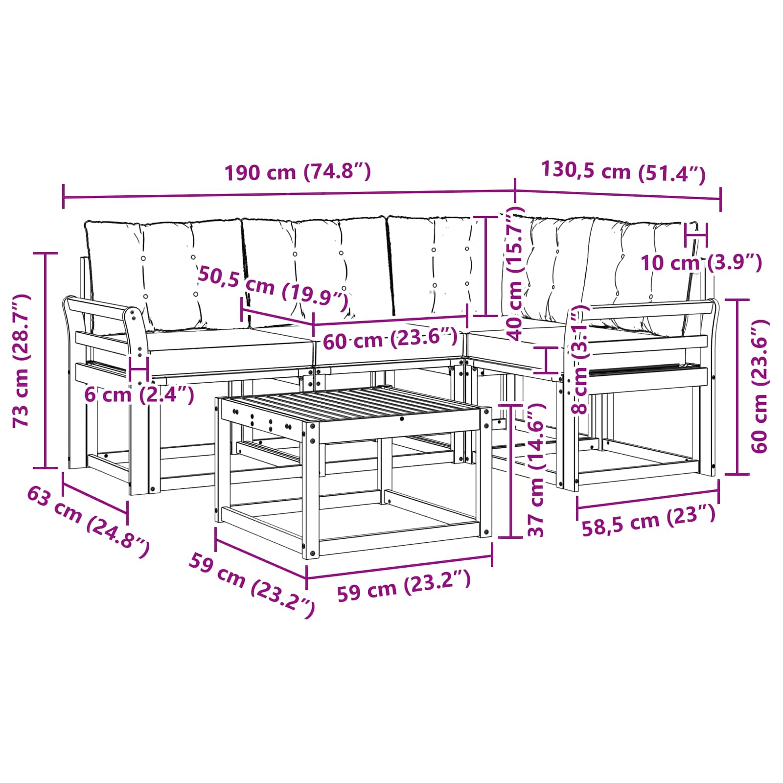 - 3 x Divano centrale: 59 x 63 x 73 cm (LxWxH)
