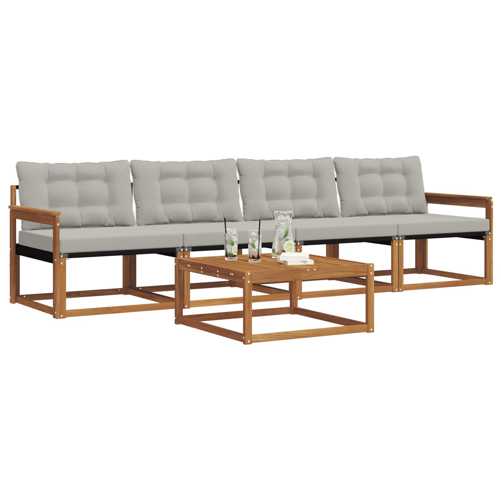 Il set di mobili da esterno combina stile e funzionalità, diventando il fulcro di ogni giardino o terrazza. Con un design moderno e linee pulite, aggiunge tocco di eleganza e invita al relax nelle occorrenze sociali. Realizzato completamente in legno massello di acacia, il set è durevole e offre un aspetto che dura nel tempo, il che lo rende la scelta perfetta per chi cerca praticità e design raffinato nei mobili da esterno.