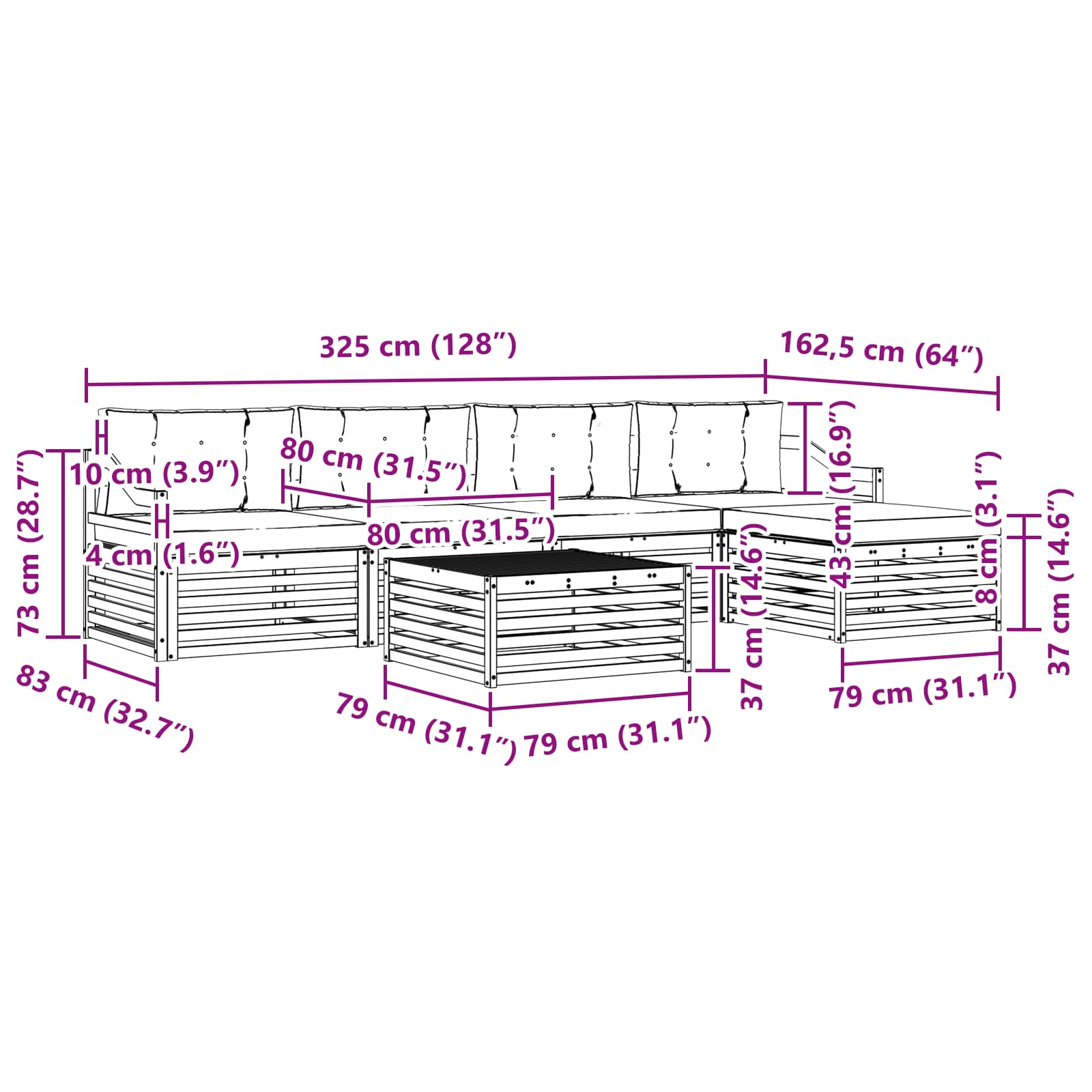 - 4 x Cuscino per Schienale: 80 x 43 x 10 cm (LxWxH)