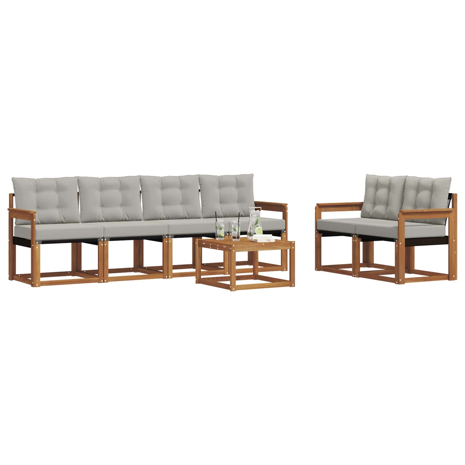 Il set di mobili da esterno combina stile e praticità, diventando il centro dell'attenzione nel tuo giardino o terrazza. Con il suo design moderno, caratterizzato da linee pulite e dettagli minimi, aggiunge un tocco di eleganza e favorisce il relax e la socialità all'aperto. Realizzato in legno massello di acacia, è resistente e visivamente accattivante, perfetto per chi cerca funzionalità e design chic nei mobili esterni.