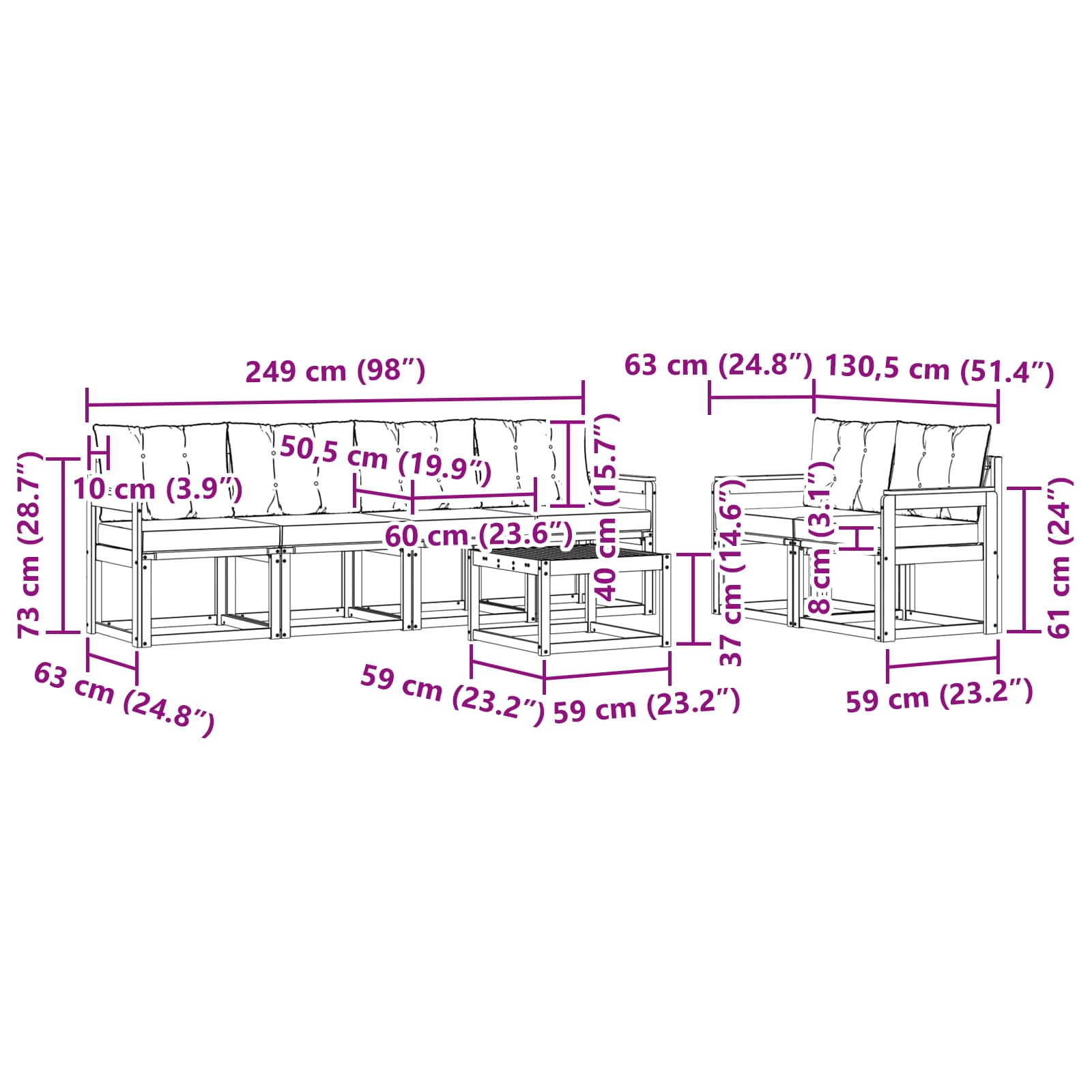 - 6 x Cuscino Posteriore: 60 x 40 x 10 cm (LxWxH)