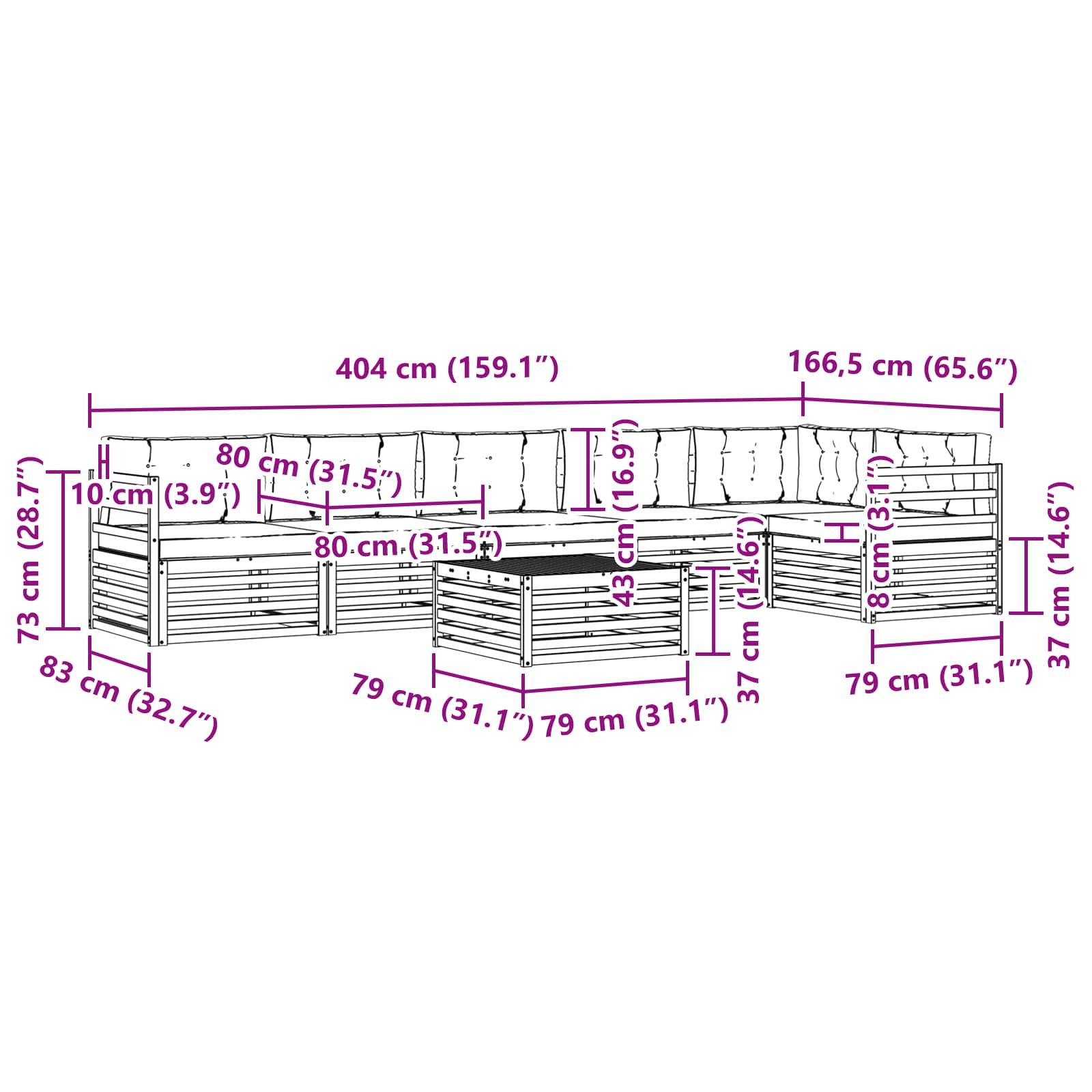- 7 x Cuscino per Schienale: 80 x 43 x 10 cm (LxWxH)
