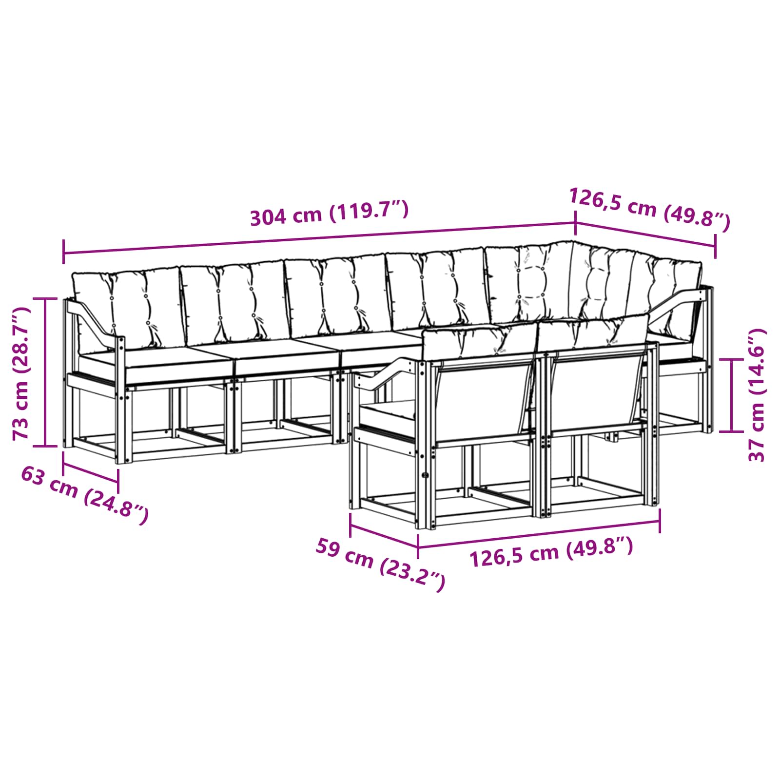- 7 x Divano centrale: 59 x 63 x 73 cm (LxWxH)