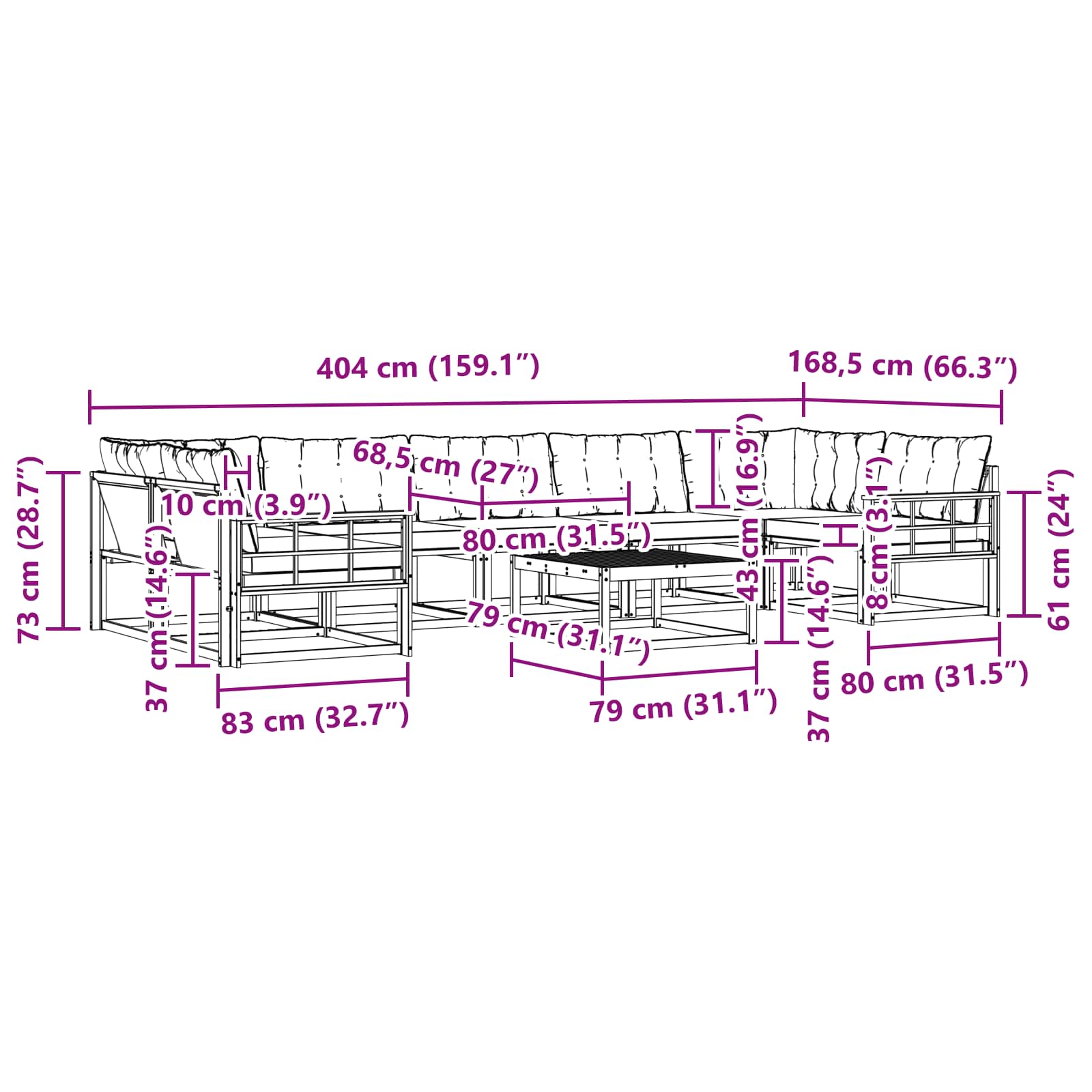 - 9 x Cuscino Posteriore: 80 x 43 x 10 cm (LxWxH)