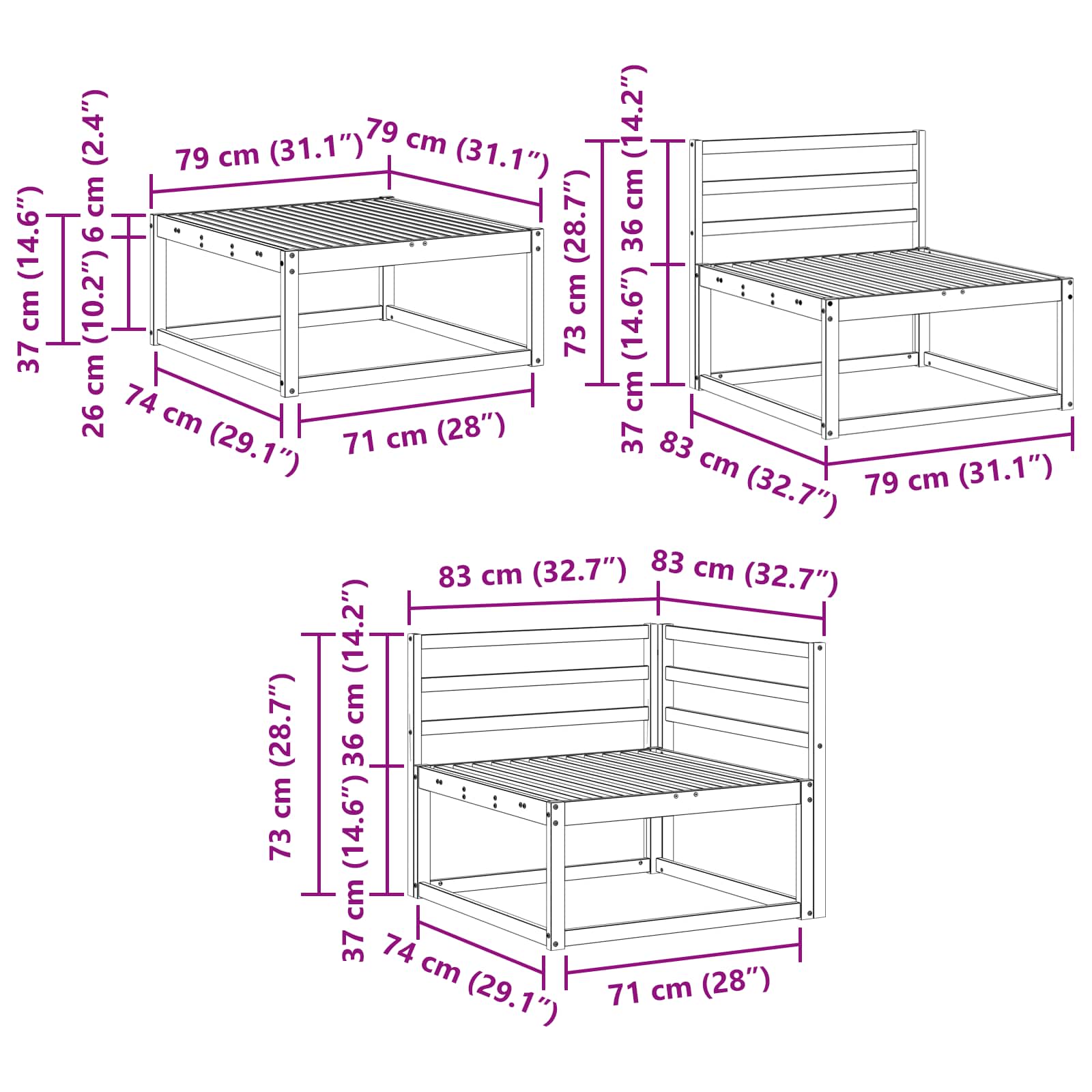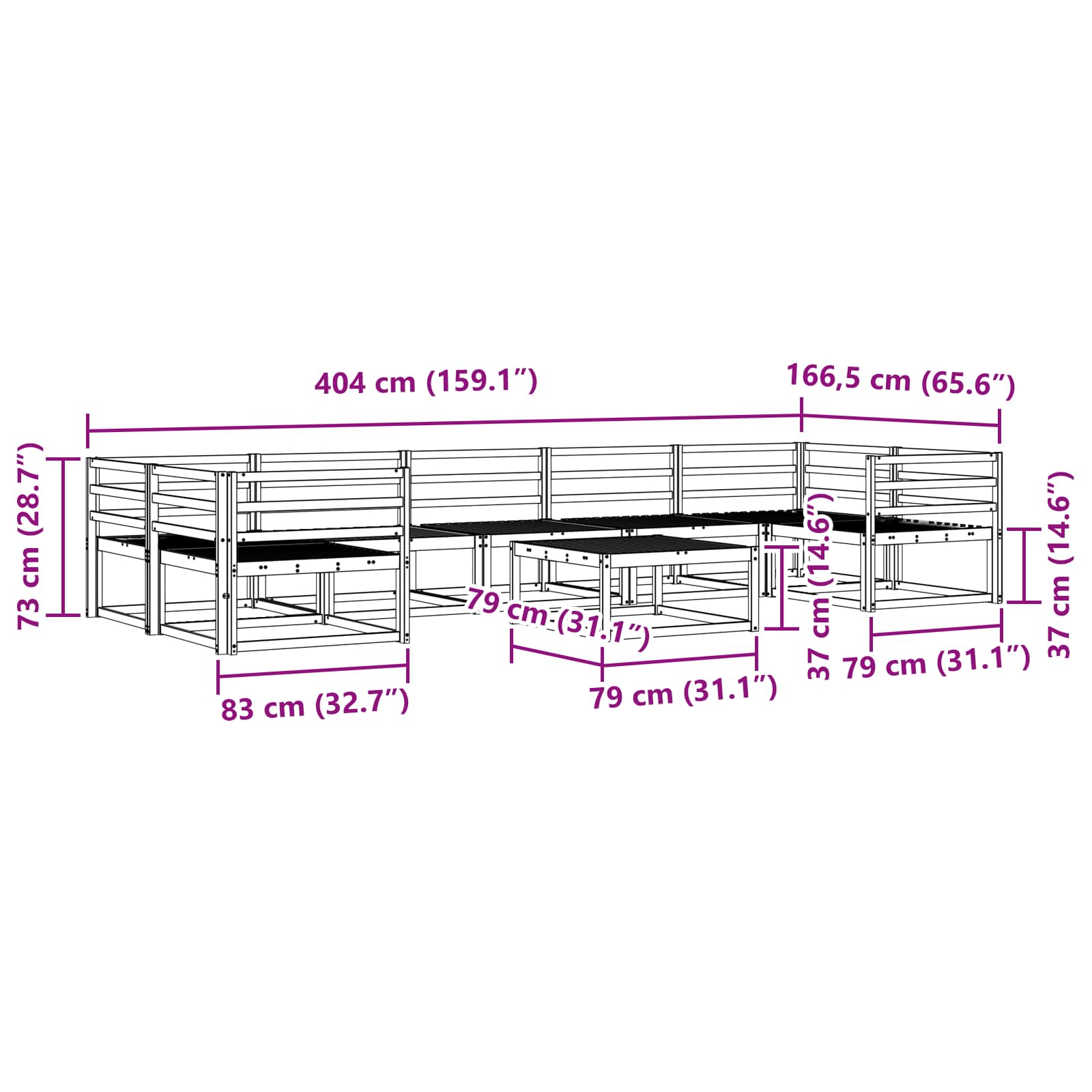 - 5 x Divano centrale: 79 x 83 x 73 cm (L x P x H)