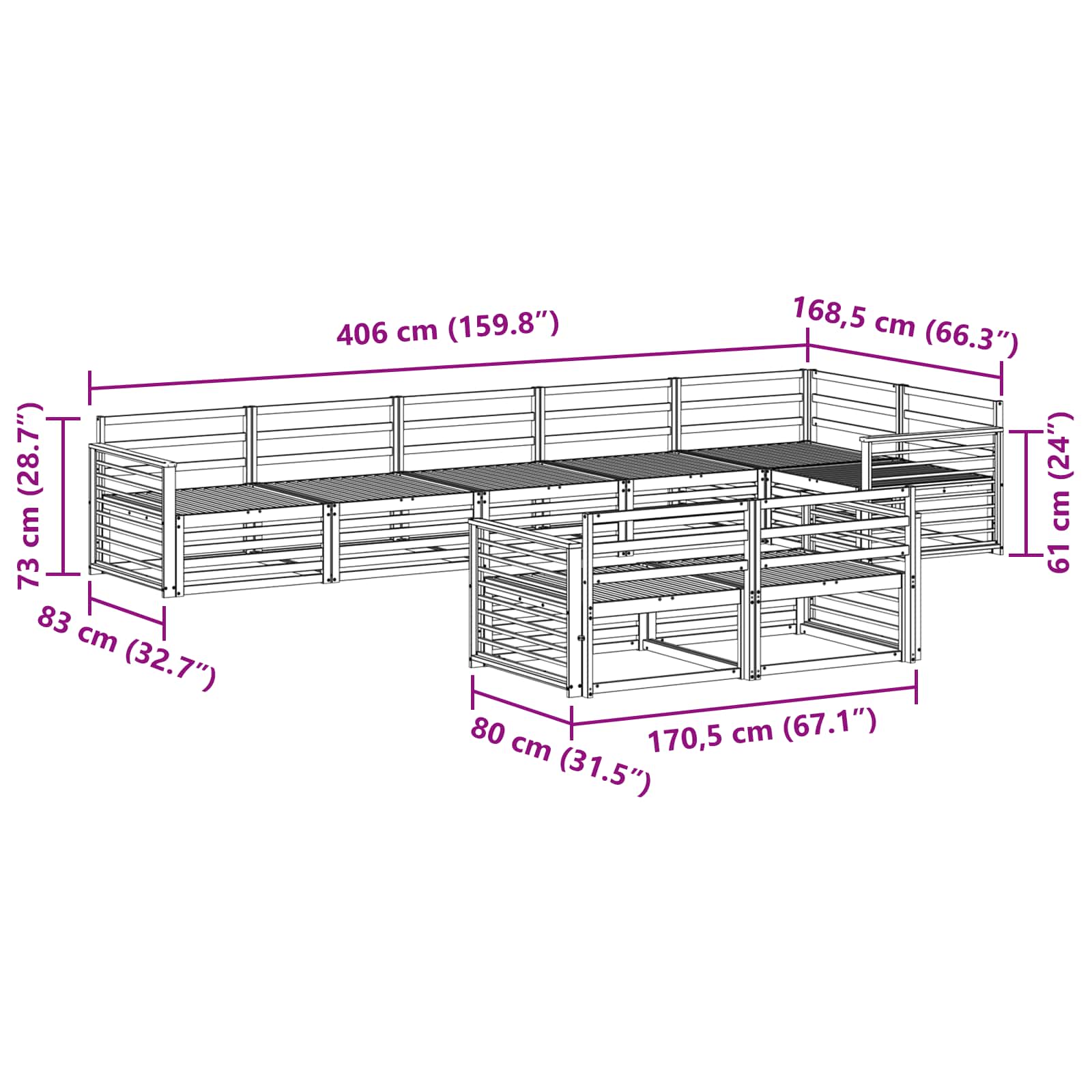 - Dimensioni complessive: 406 x 168,5 x 73 cm (L x P x A)