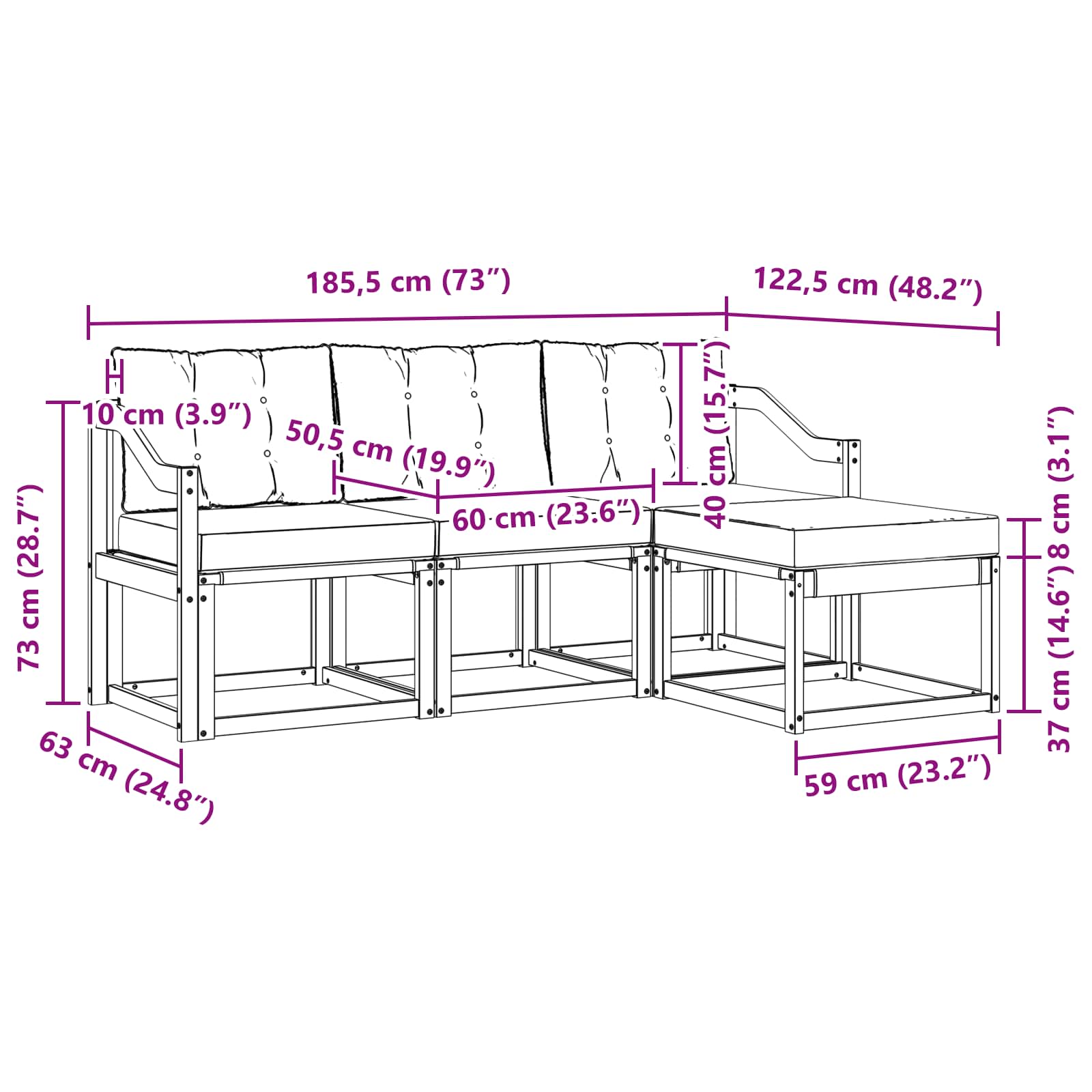 - 3 x Cuscino per Seduta: 60 x 50,5 x 8 cm (LxWxH)
