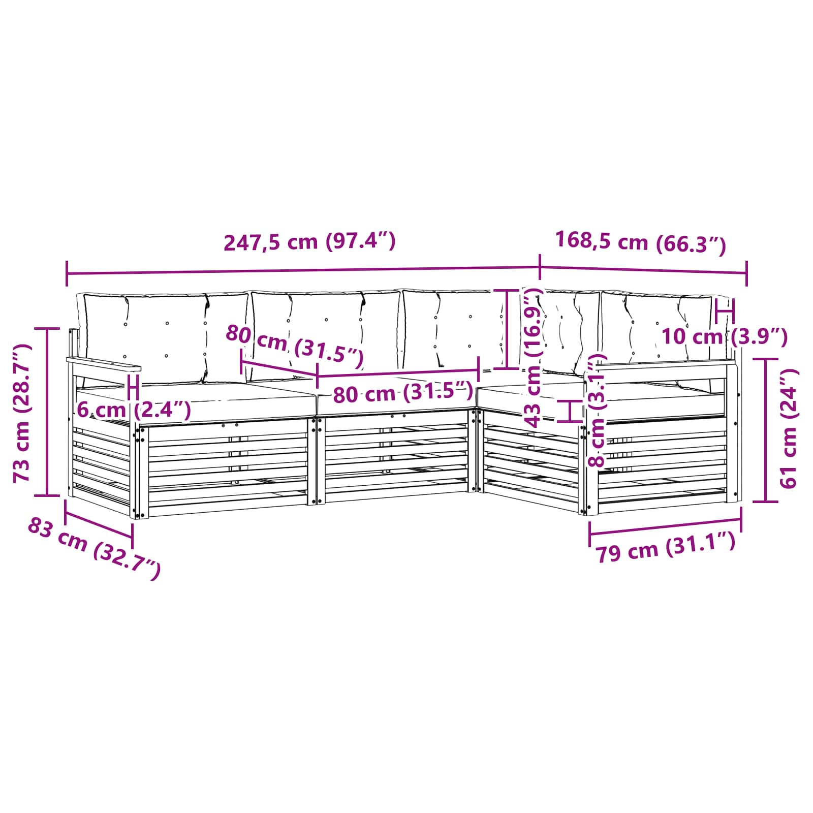 - 4 x Cuscino Seduta: 80 x 80 x 8 cm (LxWxH)