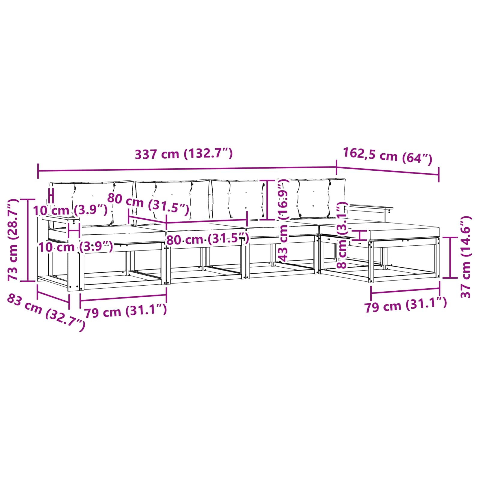 - 4 x Cuscino Posteriore: 80 x 43 x 10 cm (L x P x H)