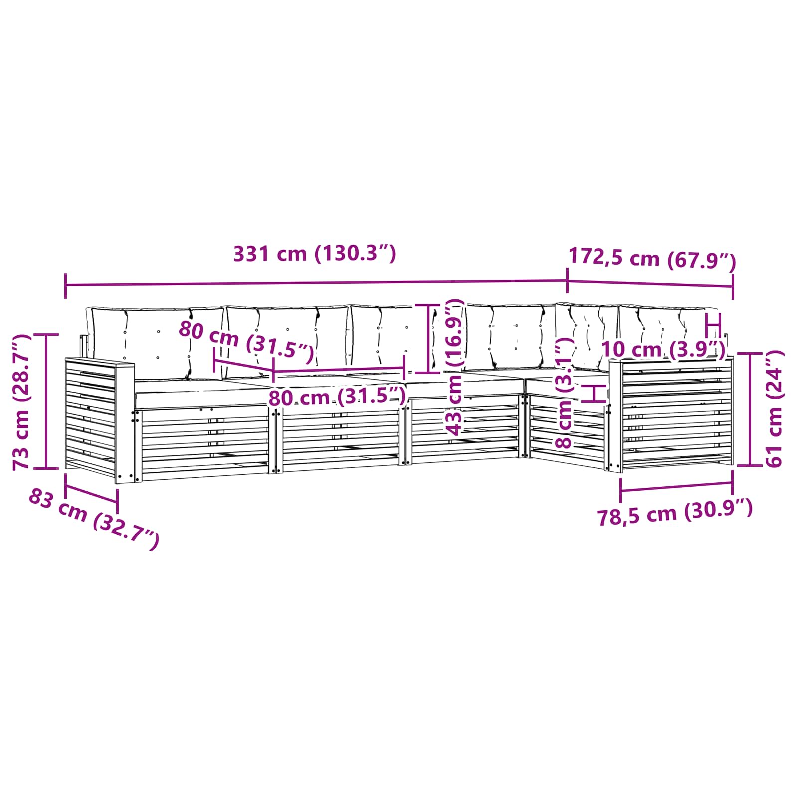 - Dimensioni complessive: 331 x 172,5 x 73 cm (L x P x A)