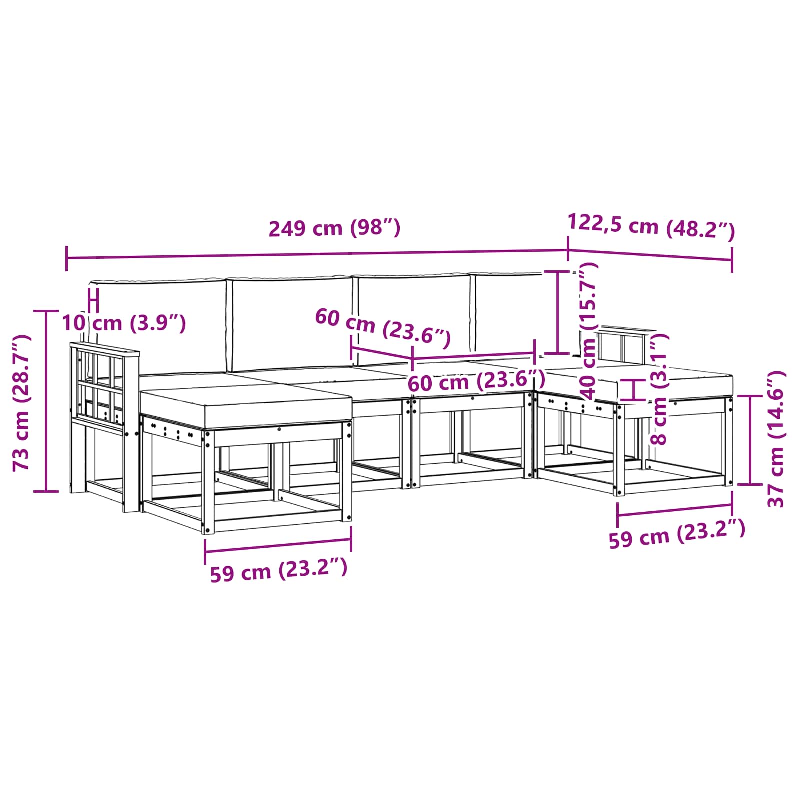 - 6 x Cuscino per Seduta: 60 x 60 x 8 cm (L x P x A)