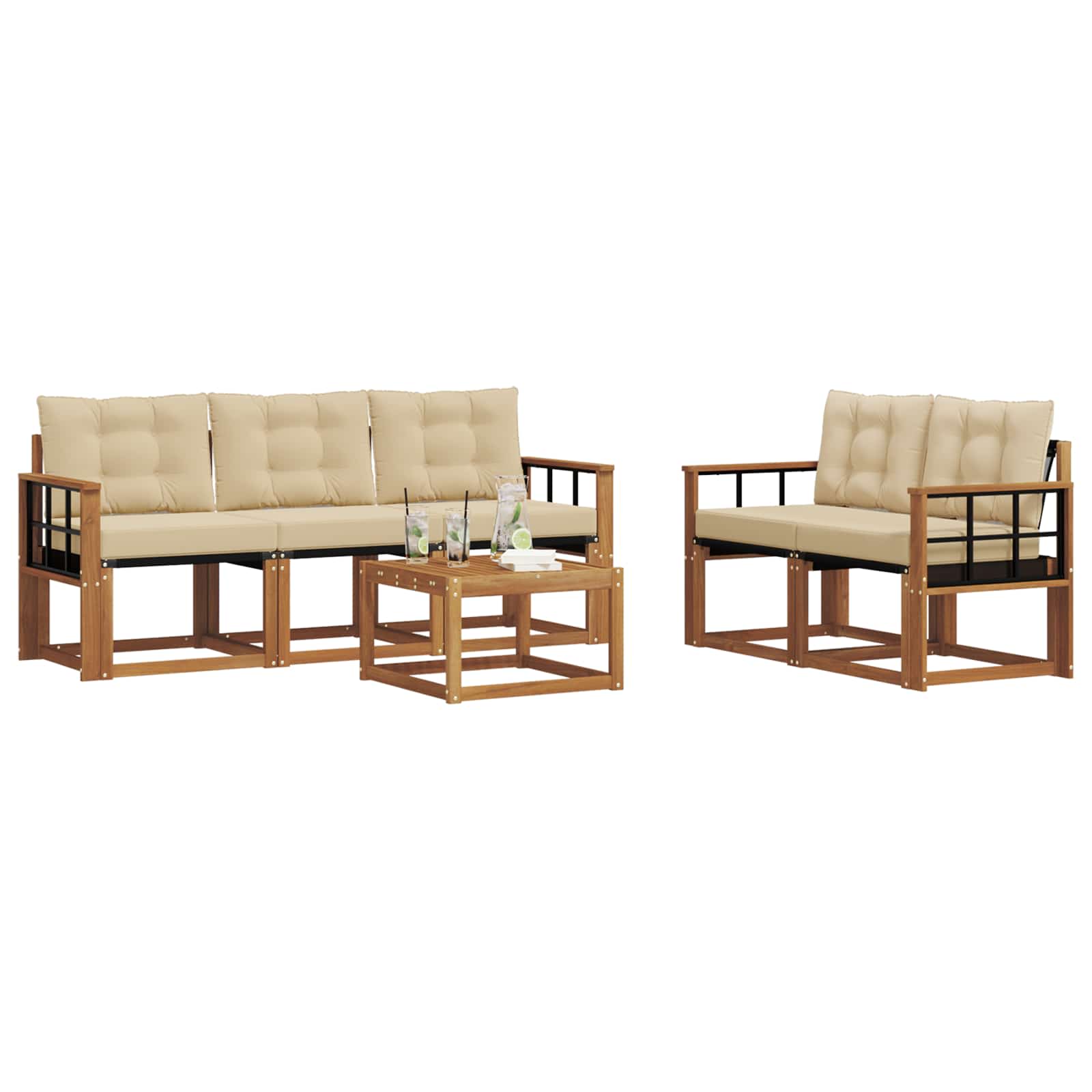 Il set di mobili da esterno unisce stile e funzionalità, creando un punto focale sorprendente per qualsiasi giardino o terrazza. Il design moderno, con linee pulite e dettagli minimali, aggiunge eleganza e sostiene il relax all'aperto e le riunioni sociali. Realizzato tutto in legno massello di acacia, il set è resistente e ha un appeal duraturo, perfetto per chi cerca praticità e un tocco raffinato nei mobili da esterno.