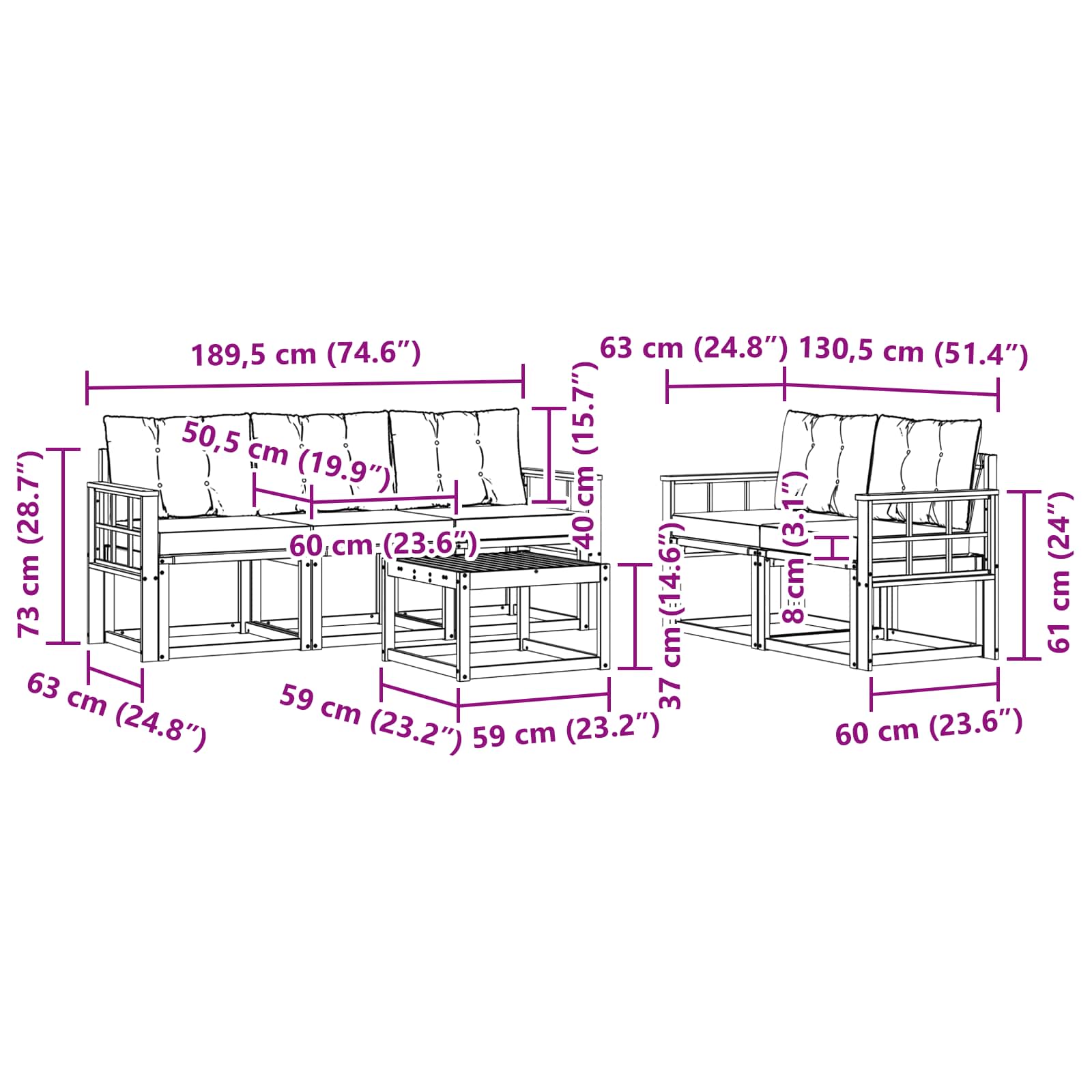 - 5 x Divano centrale: 59 x 63 x 73 cm (LxPxA)