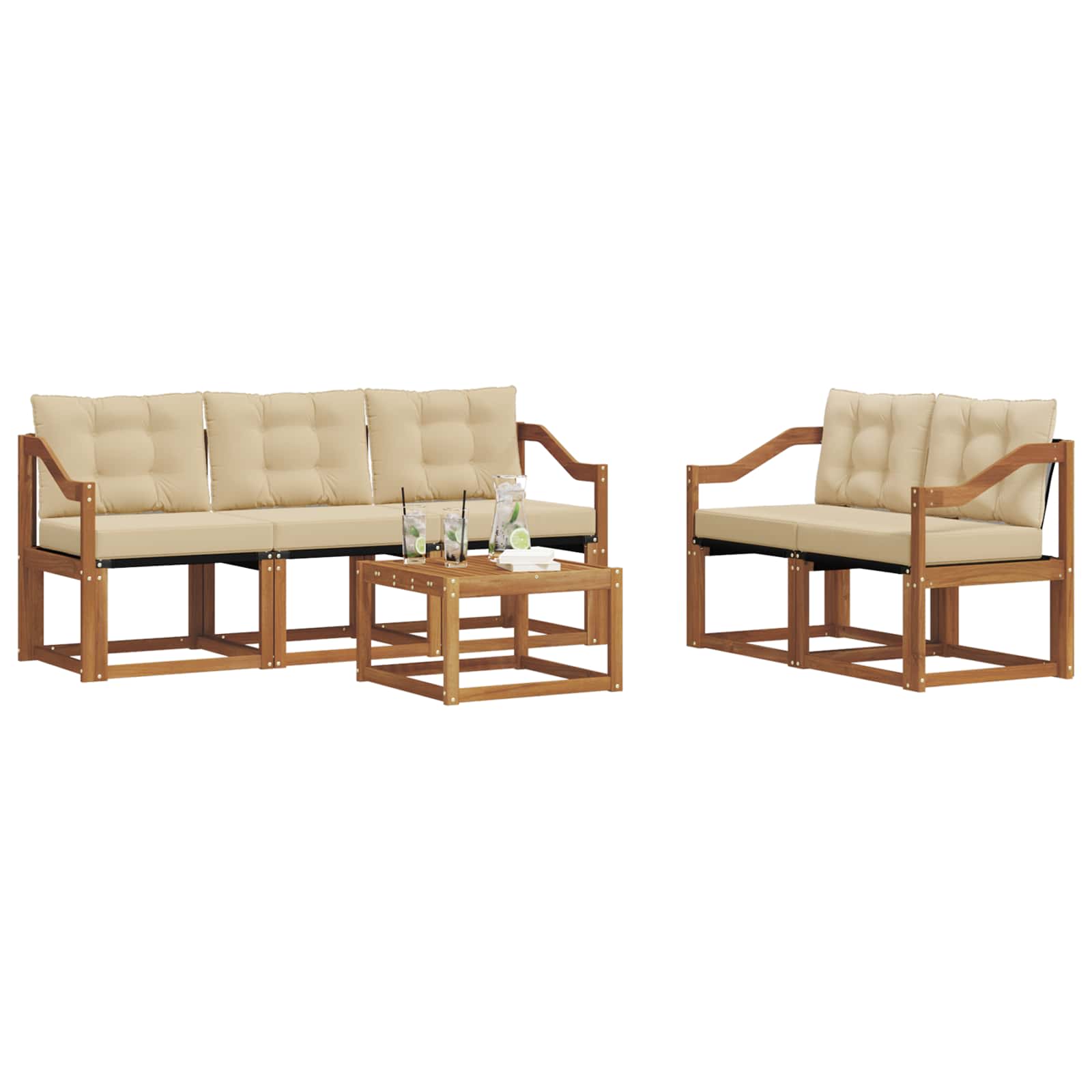 Il set di mobili da esterno unisce stile e funzionalità, creando un punto focale sorprendente per qualsiasi giardino o terrazza. Il design moderno, con linee pulite e dettagli minimali, aggiunge eleganza e sostiene il relax all'aperto e le riunioni sociali. Realizzato tutto in legno massello di acacia, il set è resistente e ha un appeal duraturo, perfetto per chi cerca praticità e un tocco raffinato nei mobili da esterno.