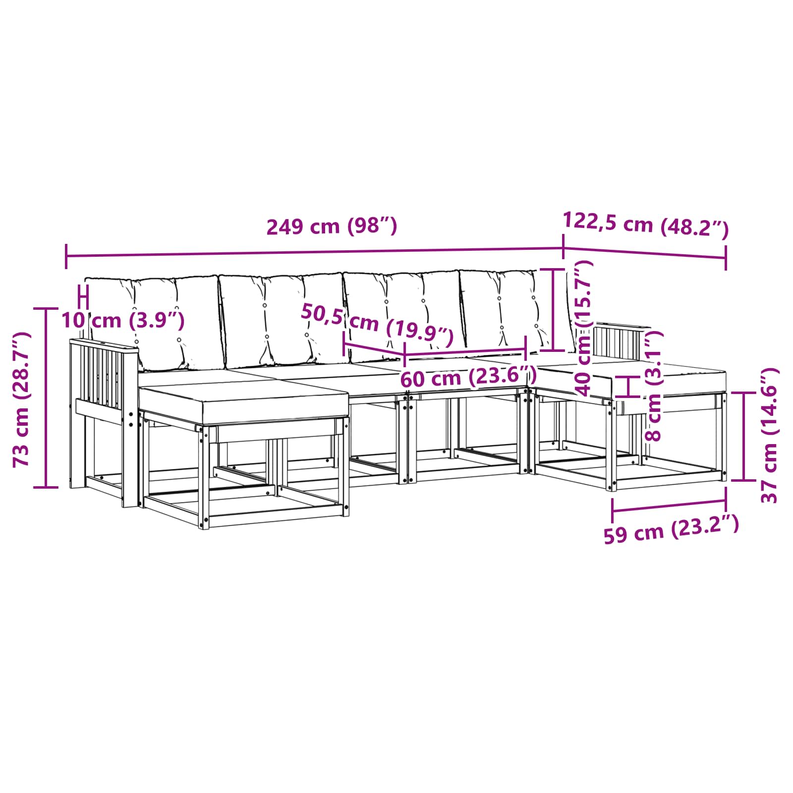 - 2 x Puff: 59 x 59 x 37 cm (LxPxA)