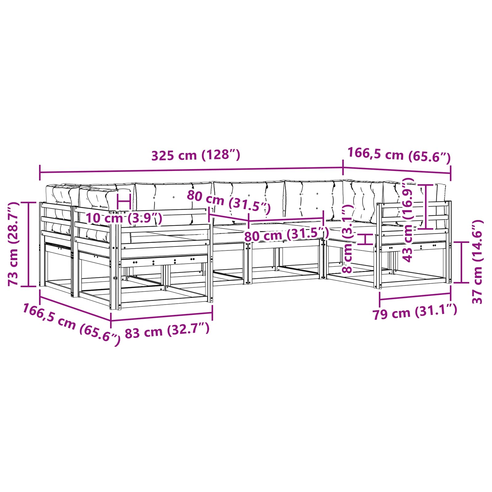 - 8 x Cuscino per Schienale: 80 x 43 x 10 cm (LxPxA)