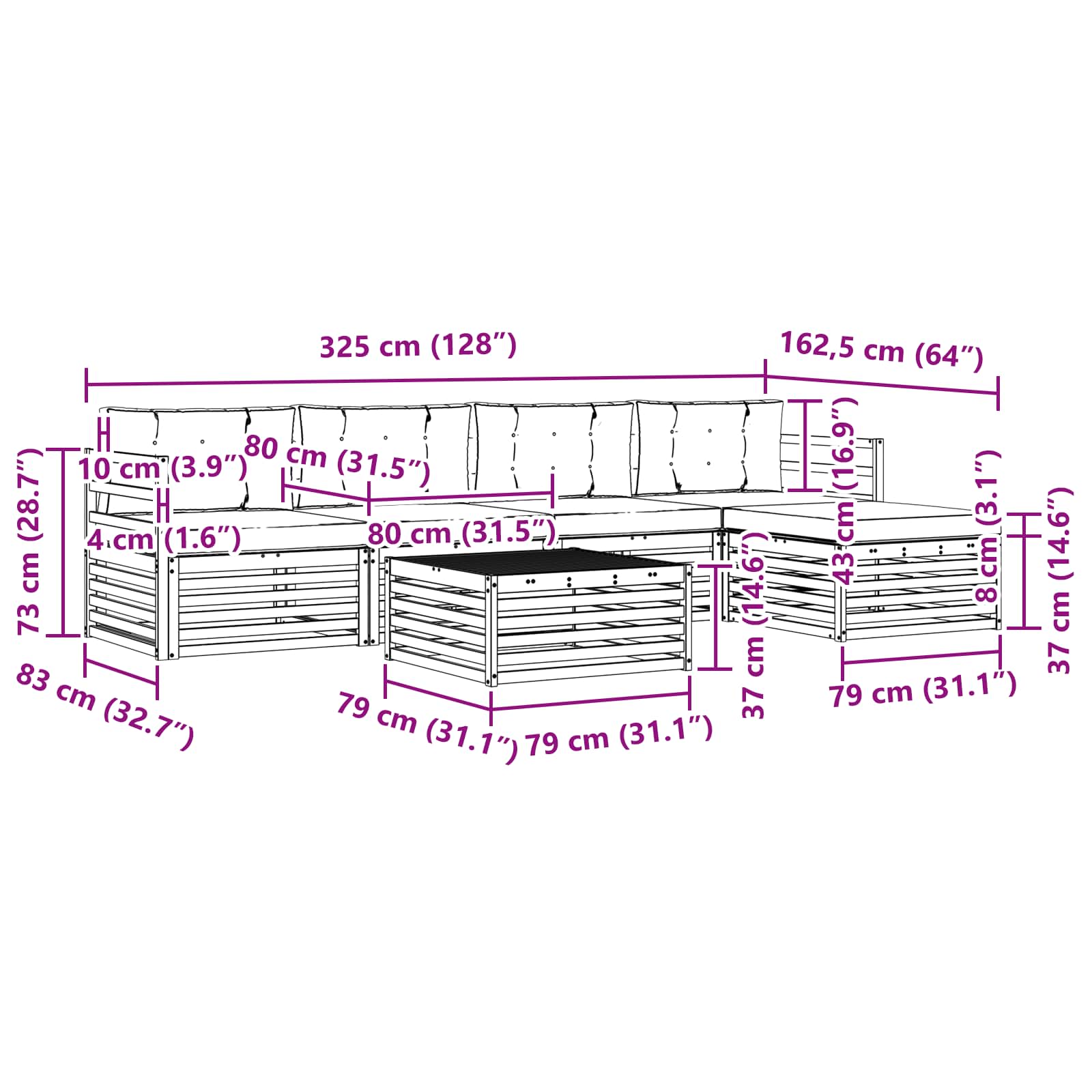 - 4 x Cuscino per Schienale: 80 x 43 x 10 cm (LxWxH)