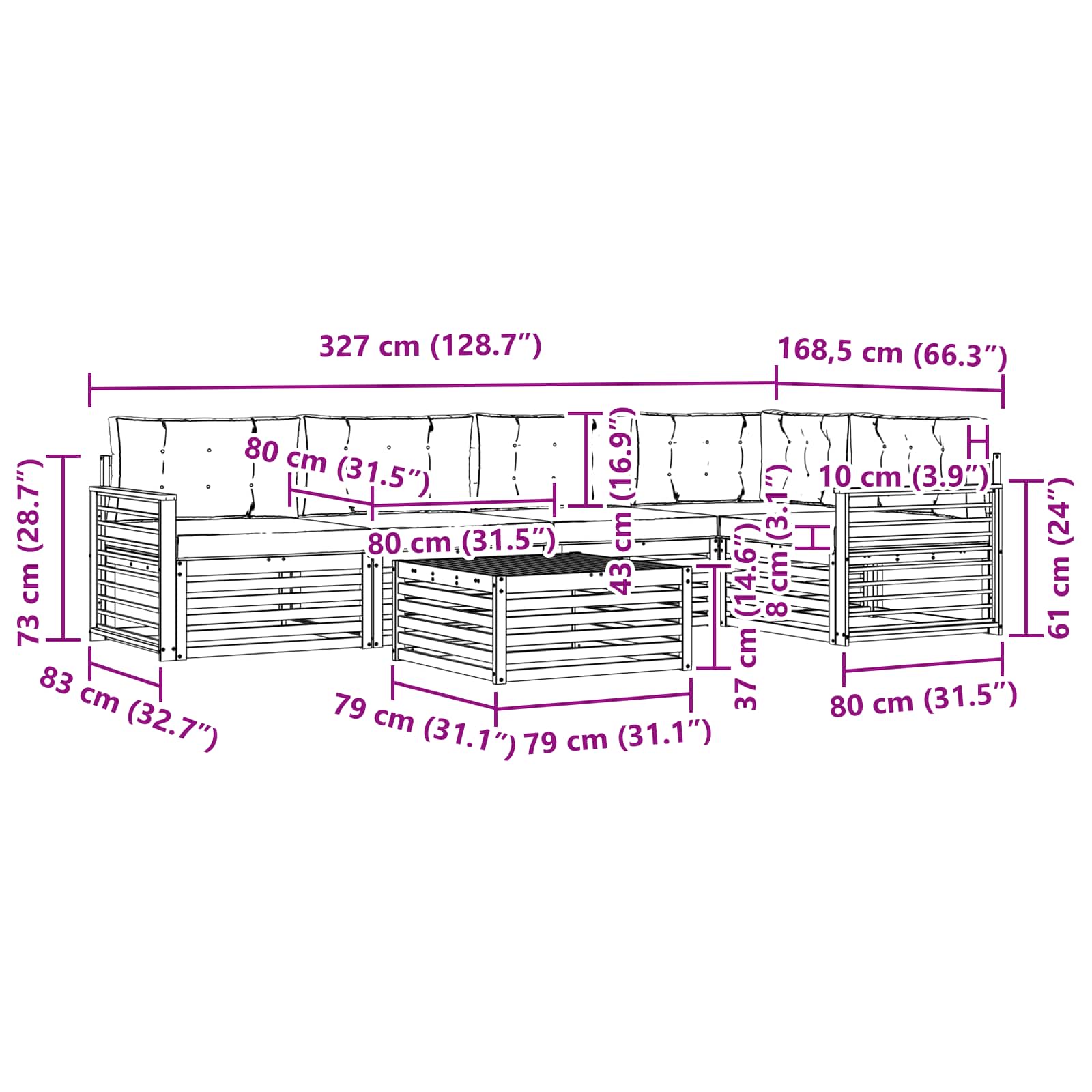 - 4 x Divano centrale: 79 x 83 x 73 cm (LxWxH)