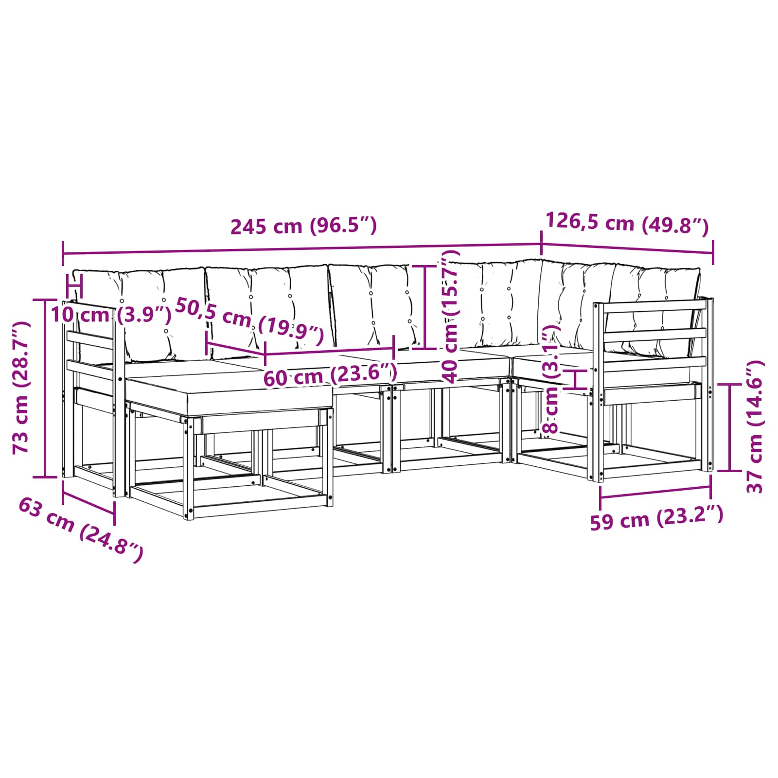 - 6 x Cuscino Posteriore: 60 x 40 x 10 cm (LxWxH)
