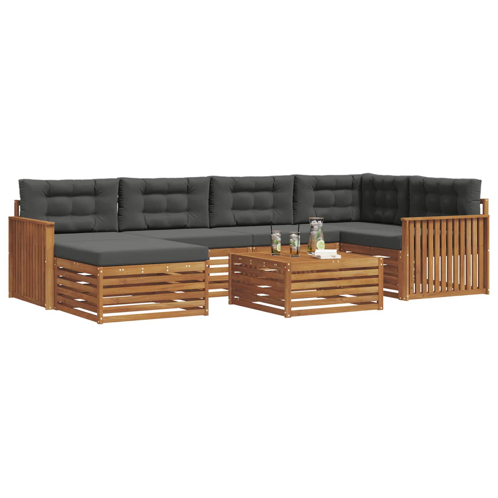 Il set di mobili da esterno combina stile e funzionalità, diventando il punto focale di qualsiasi giardino o terrazza. Con un design moderno e linee pulite, aggiunge eleganza e favorisce relax e momenti sociali. Realizzato in legno massello di acacia, è progettato per durare e offre un aspetto che resiste al tempo, rendendolo una scelta ideale per chi cerca praticità e stile nei mobili da esterno.