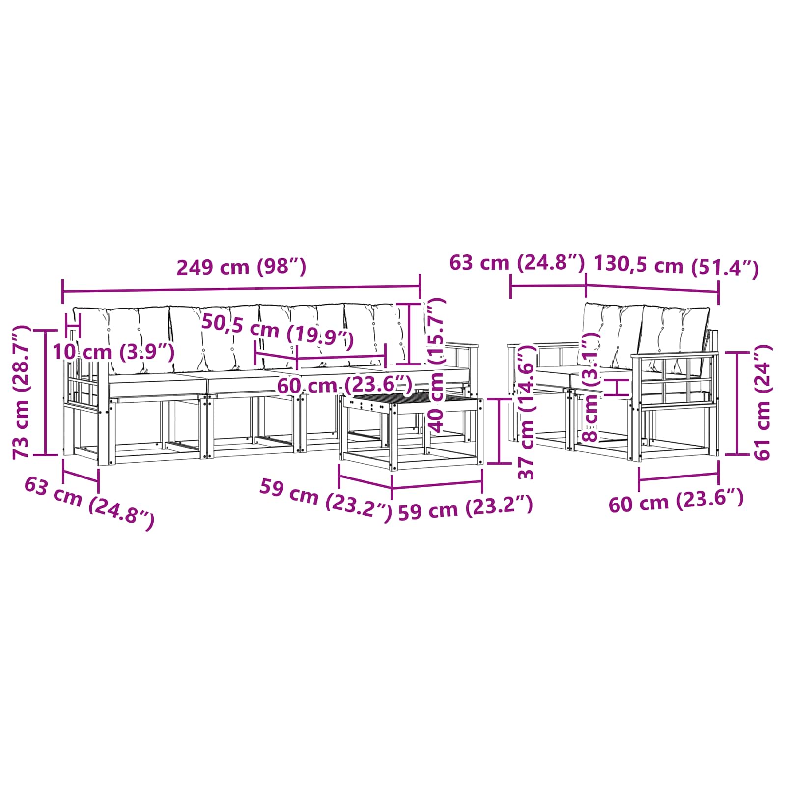 - 6 x Cuscino Posteriore: 60 x 40 x 10 cm (LxWxH)