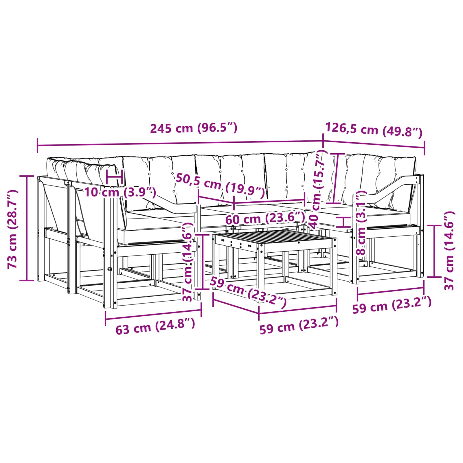 - 8 x Cuscino per Schienale: 60 x 40 x 10 cm (LxWxH)