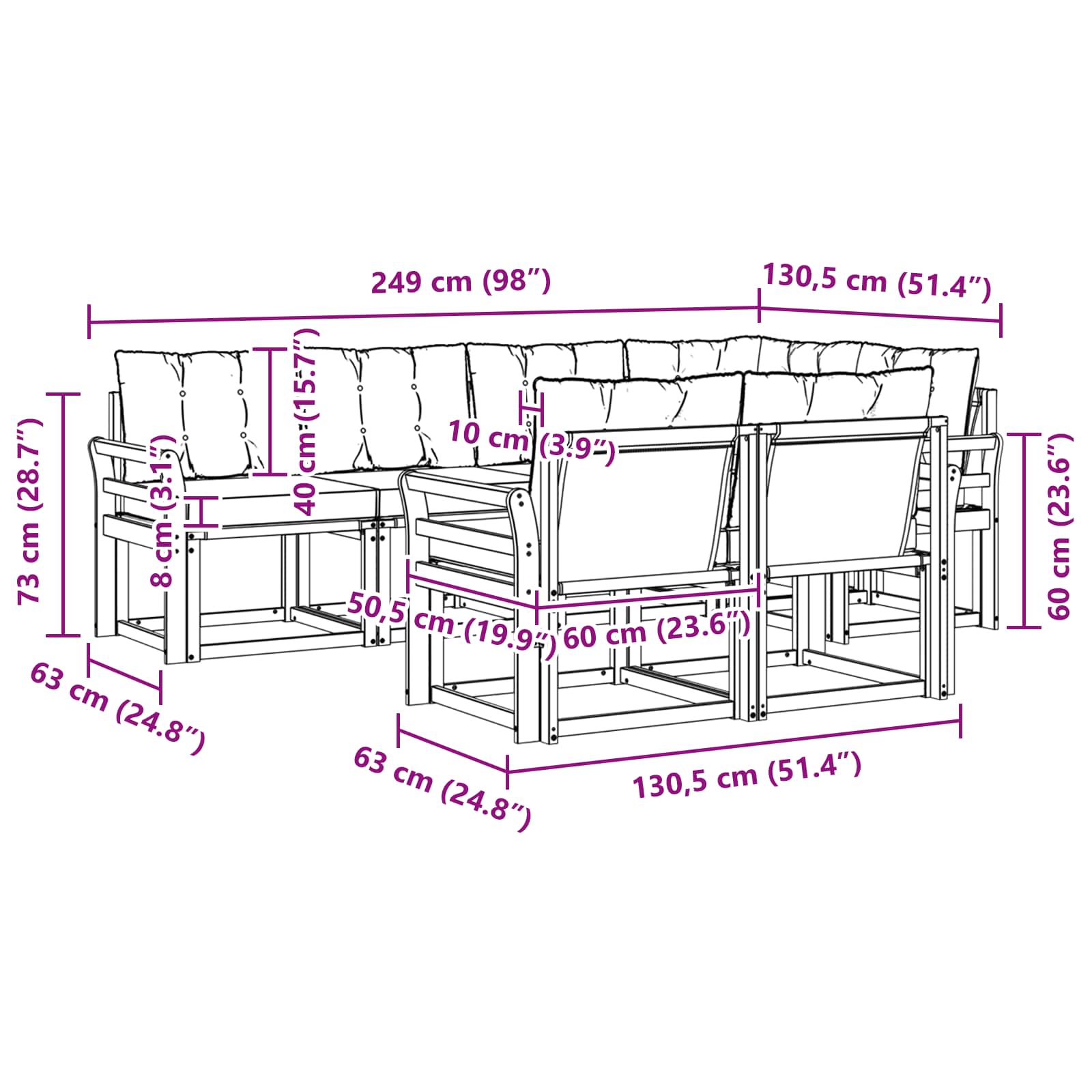 - 8 x Cuscino posteriore: 60 x 40 x 10 cm (LxPxH)