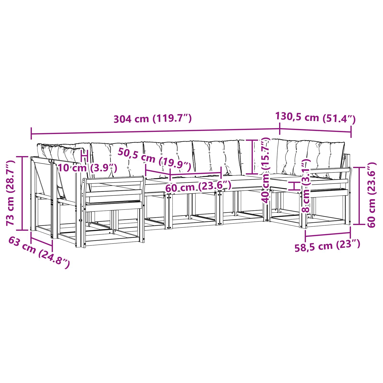 - 5 x Cuscino di seduta: 60 x 50,5 x 8 cm (LxPxA)