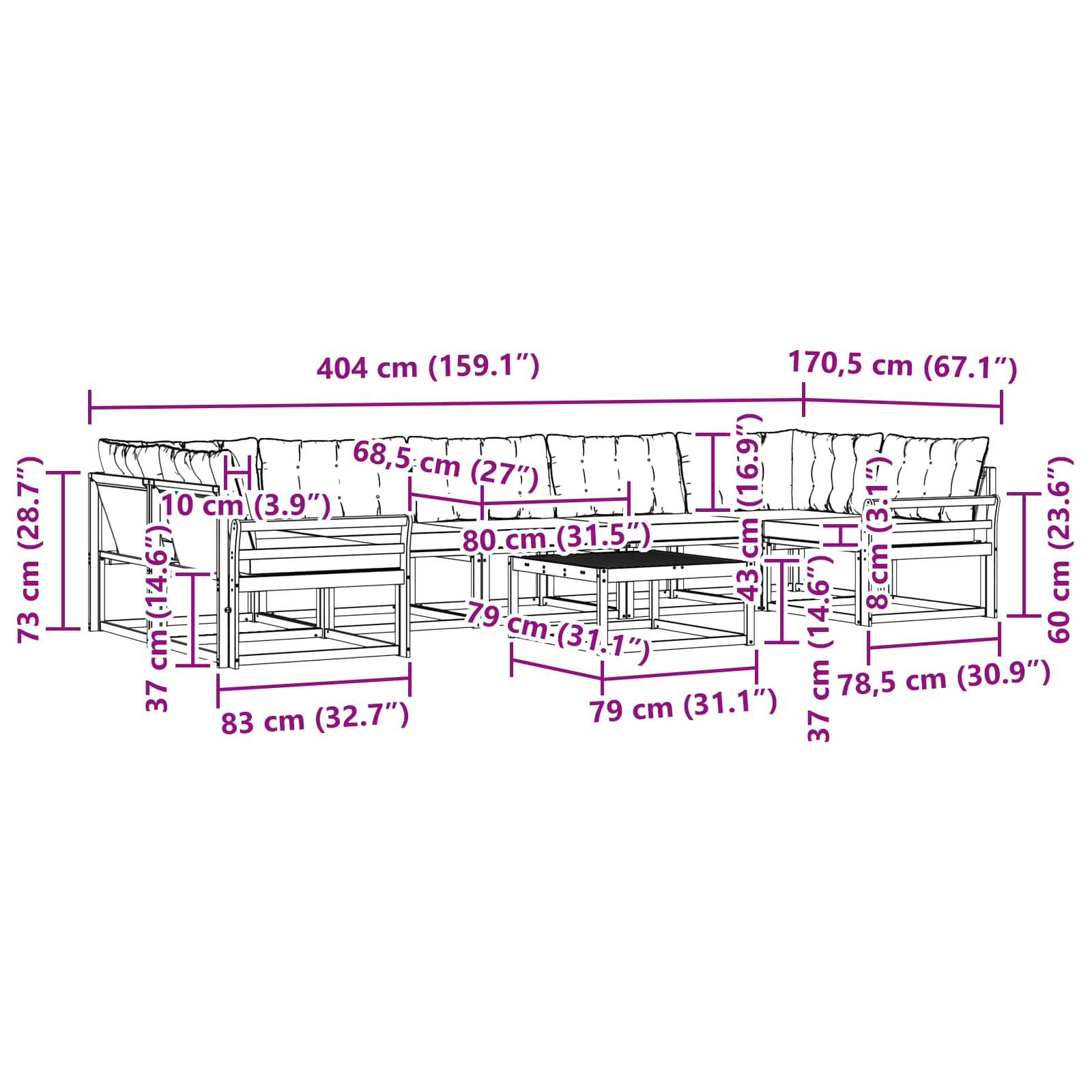 - 9 x Cuscino per Schienale: 80 x 43 x 10 cm (LxPxA)